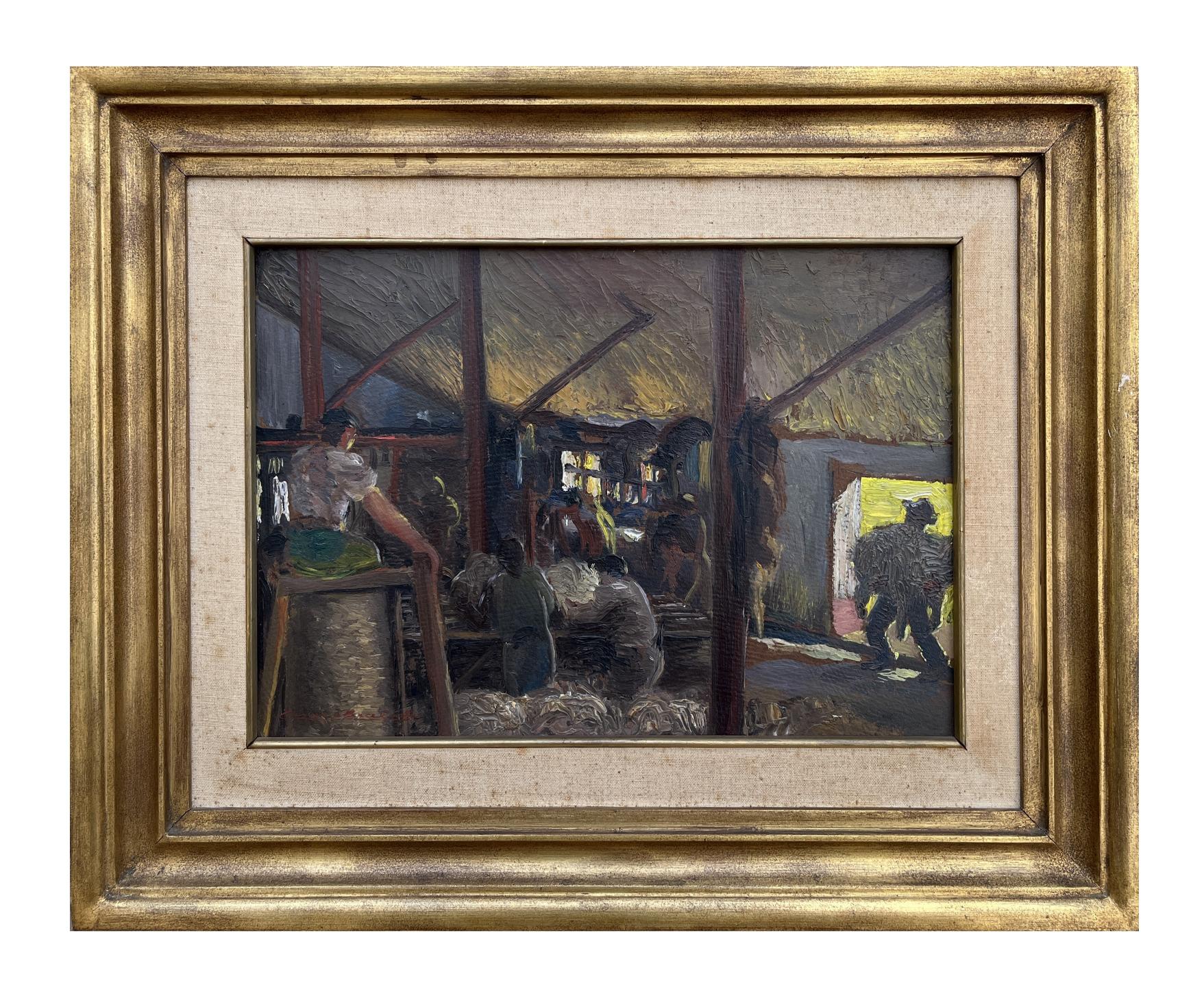 CÉSAR PESCE CASTRO (escuela uruguaya, 1890, 1977). Óleo sobre fibra. «Galpón de esquila.» Firmado abajo a la izquierda. 24 x 35 cm.