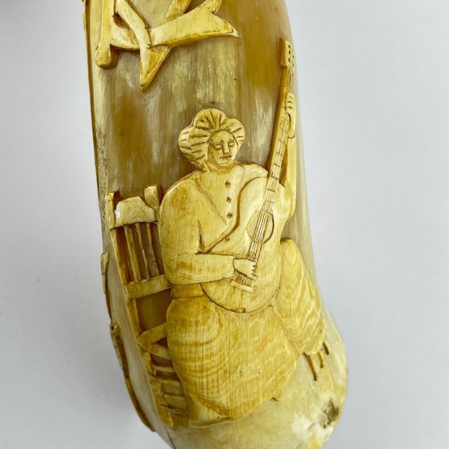 Chifle en guampa tallada «china con guitarra», iniciales «E.V.» e inscricpión «9. de ago 1905», con tapón en guampa. Falta tapa. Largo 29 cm.