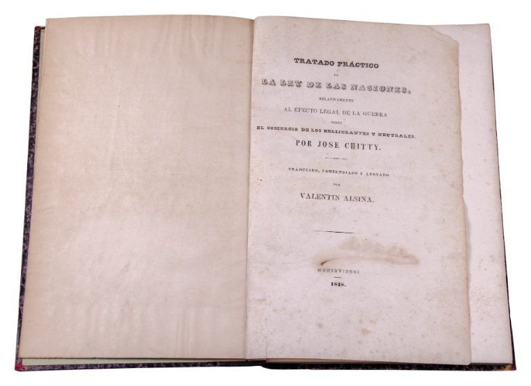 CHITTY, JOSÉ – ALSINA, VALENTÍN (TRADUCTOR). “Tratado práctico de la Ley de las Naciones relativamente al efecto legal de la guerra sobre el comercio de los beligerantes y neutrales”. Montevideo, 1848.
