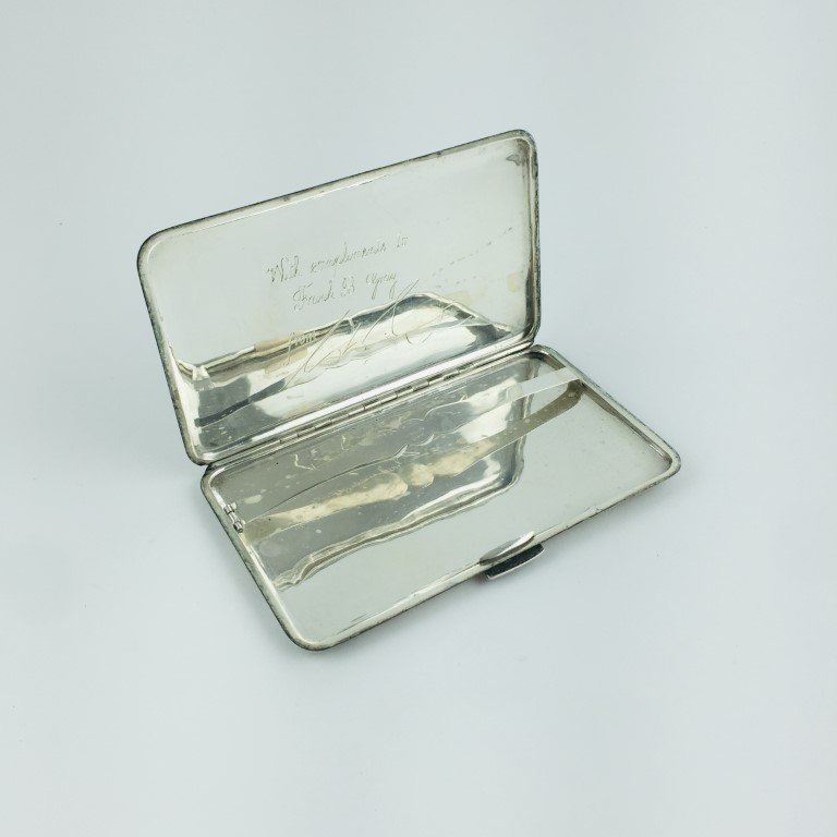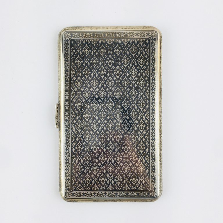 Cigarrera de bolsillo en plata Sterling de Siam. Tapas nieladas, la frontal decorada “deidad oriental”. Dedicatoria grabada en interior. 14 x 8.5 cm.