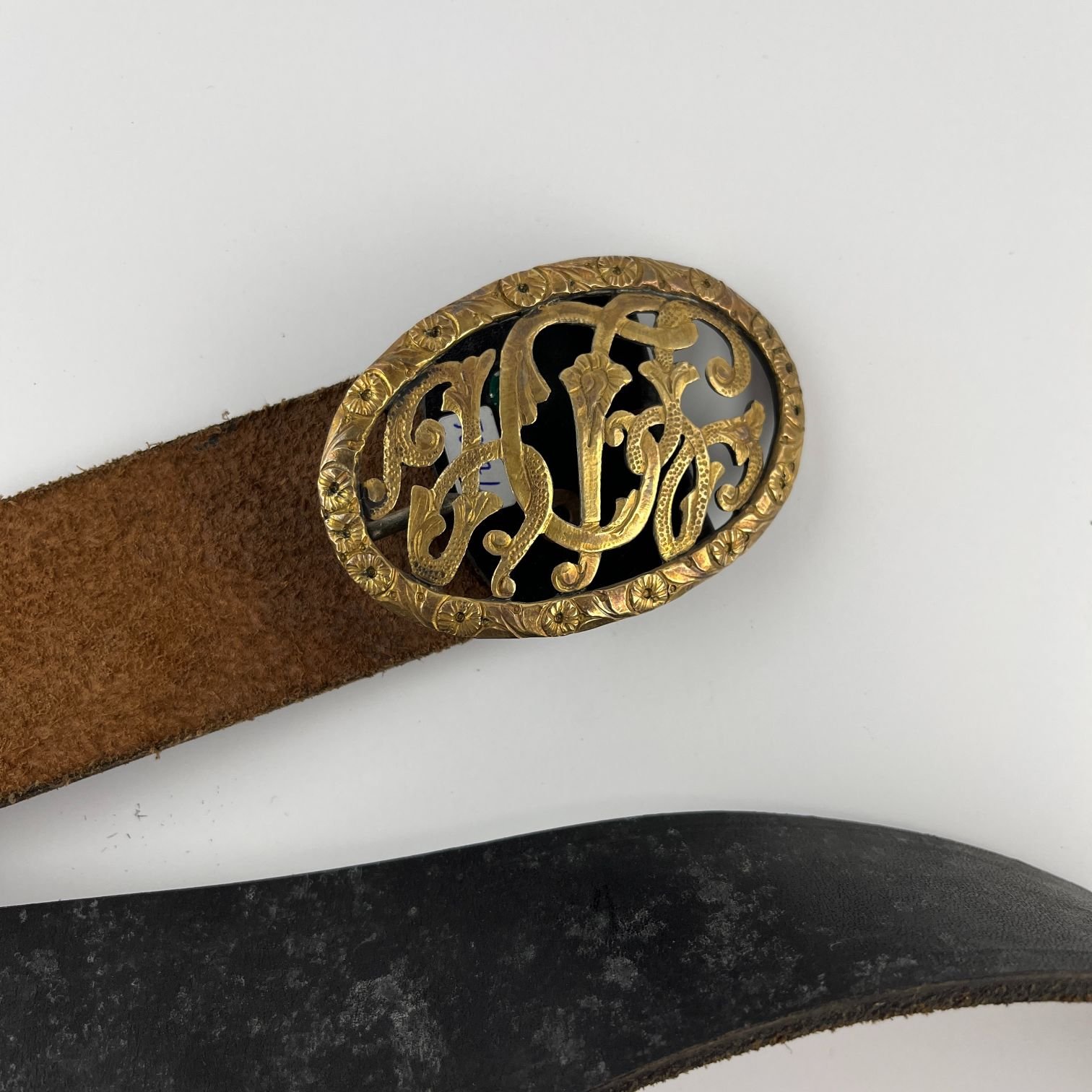 Cinto gaucho en cuero negro con hebilla en oro y plata cincelada y calada, con iniciales «J.D.L.».