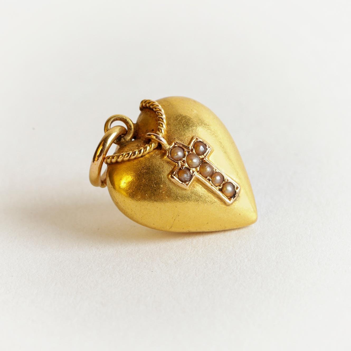 Colgante en oro 18 K amarillo esculturado en forma de corazón, cincelado «cruz», con siete pequeñas perlas de cultivo. Alto 25 mm. Peso bruto 2.9 gr.