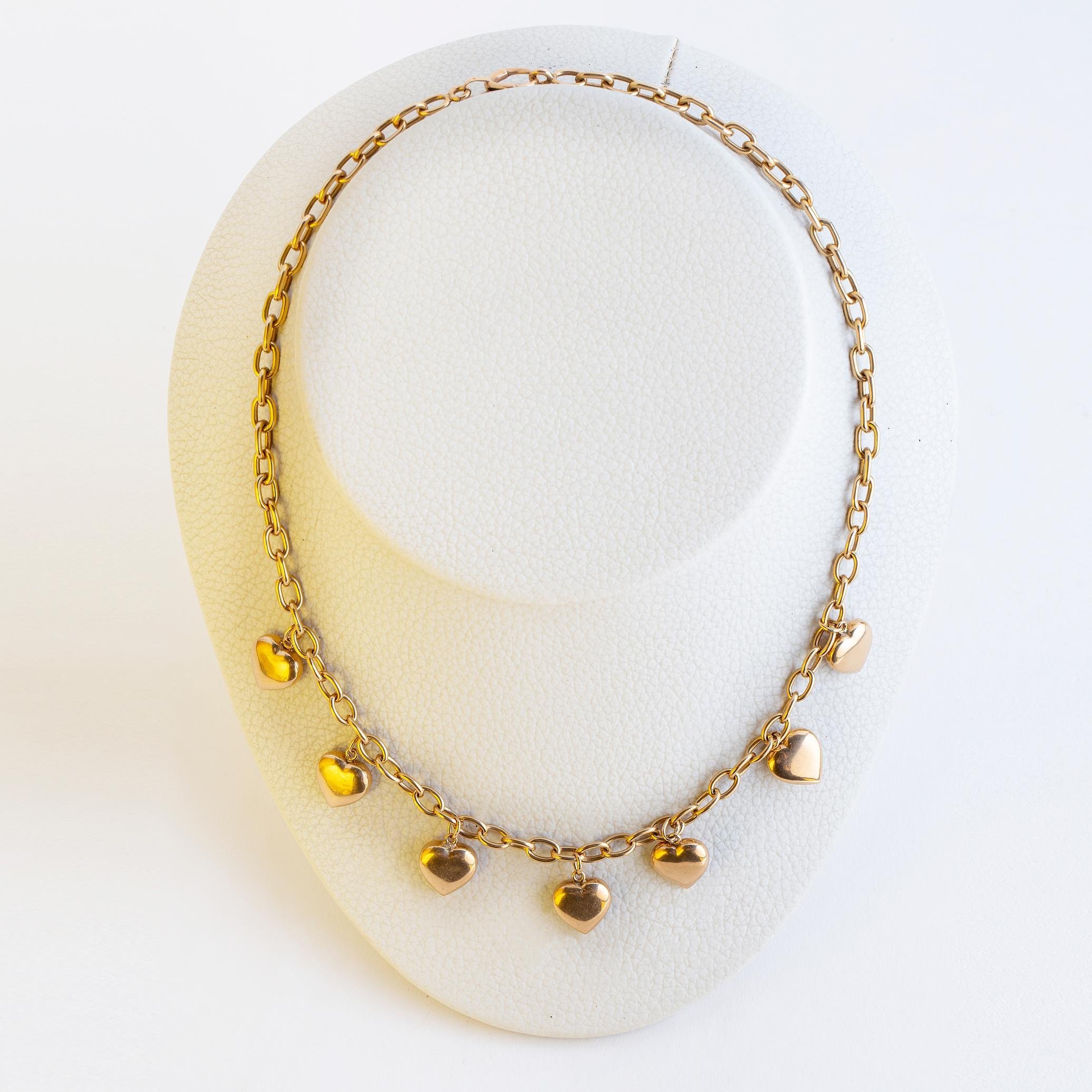 Collar de eslabones en oro 18 K amarillo con siete dijes en forma de corazón. Peso 34 gr.
