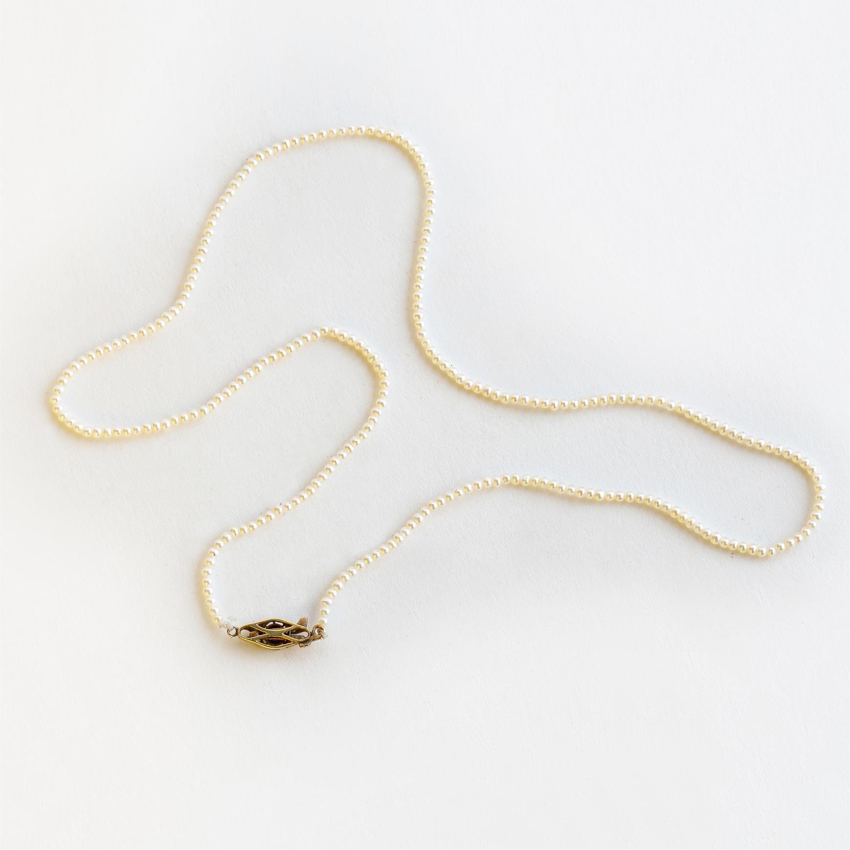 Collar en un hilo de perlas de cultivo de un diámetro de 2 mm, con broche en oro 18 K en oro amarillo y blanco con pequeño zafiro central. Largo 42 cm.