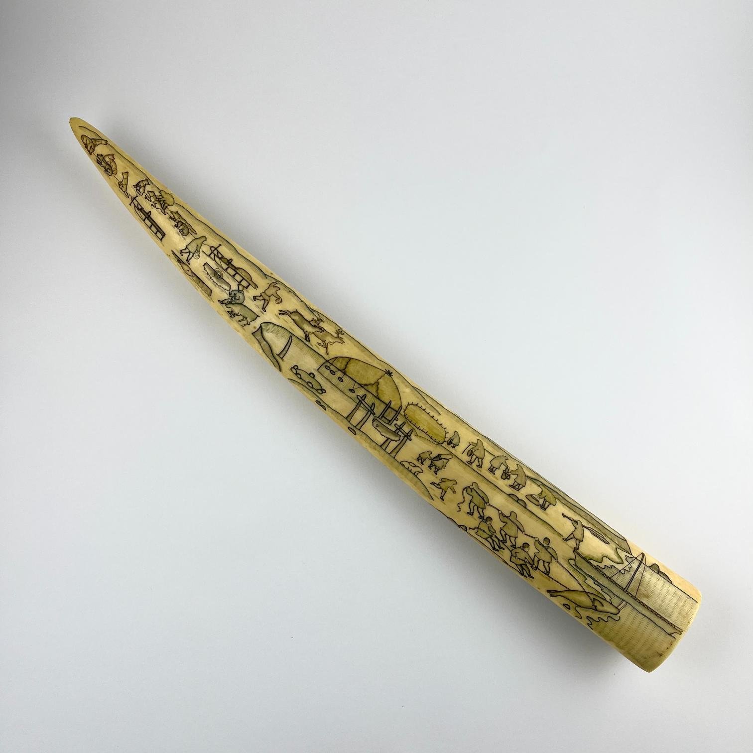 Colmillo de morsa tallado y policromado «escenas de cacería», con firma ilegible de origen ruso. Largo 52 cm. Peso 1.100 gr.