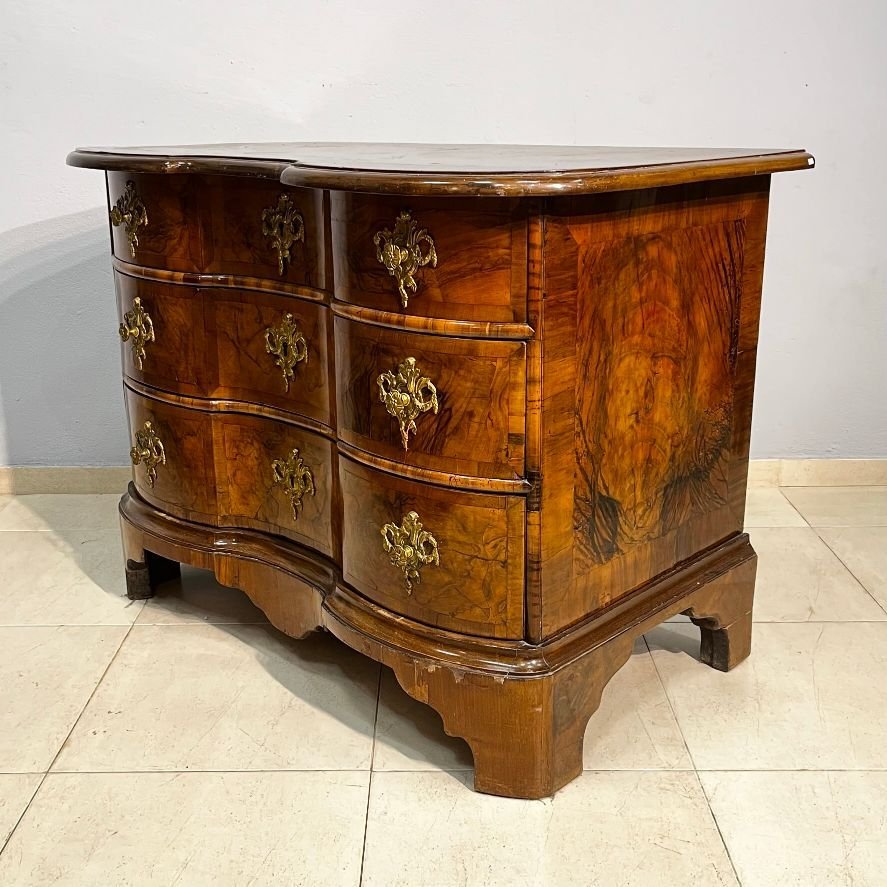 Cómoda austríaca s. XVIII enchapada en palo de rosa y raíz. Tres cajones con tiradores en bronce dorado y cincelado. 84 x 112 x 67 cm. Averías en enchapado.