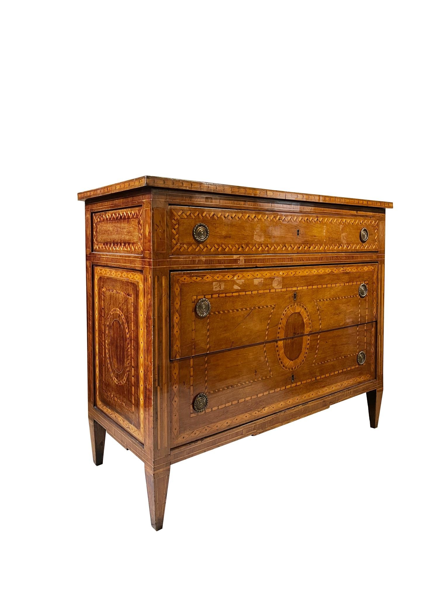 Cómoda italiana s. XVIII en madera decorada con marqueterie lineal en distintas maderas. Tres cajones con herrajes y tiradores en bronce. 104 x 207 x 55 cm.