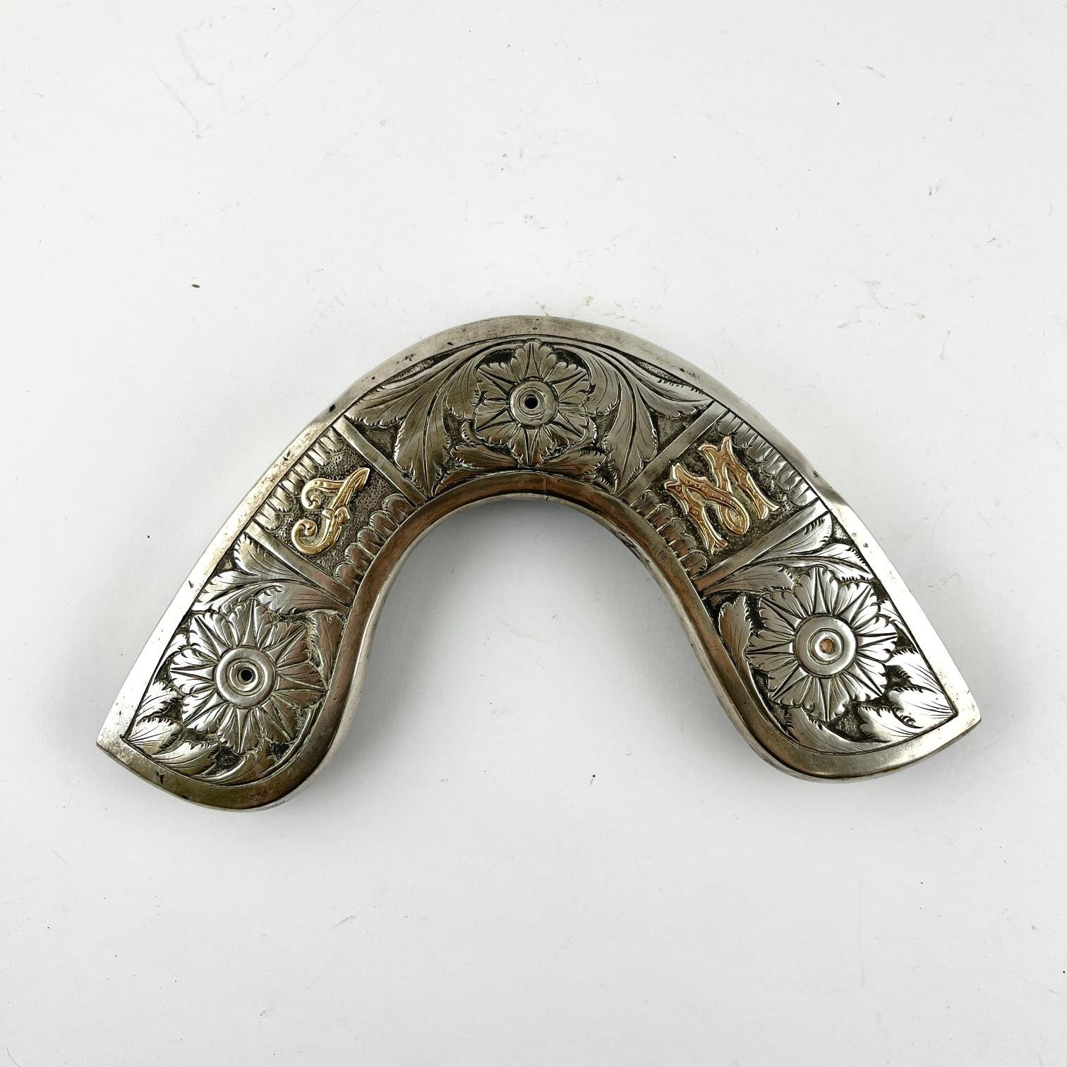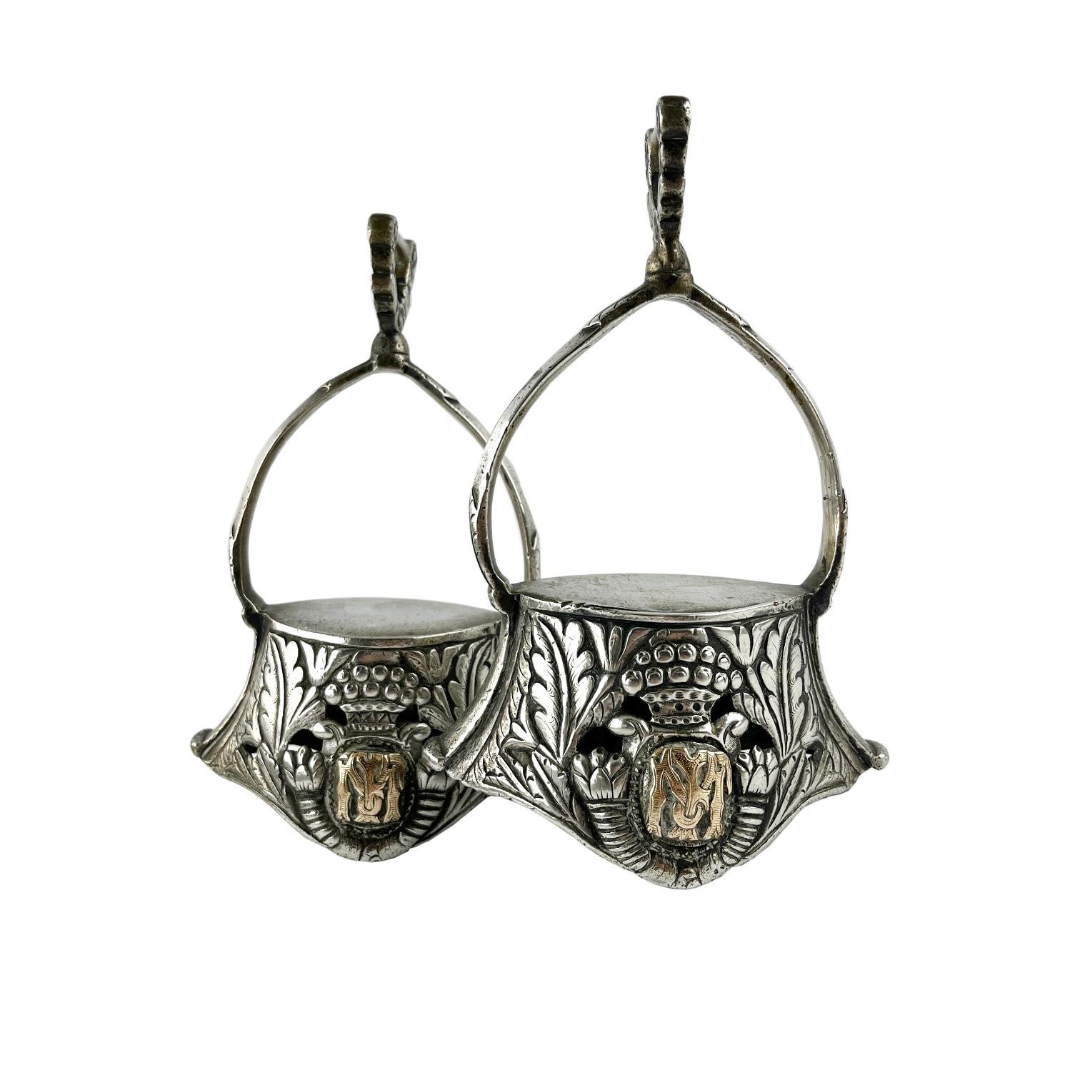 Conjunto de cabezada de recado tipo lomillo y par de estribos riograndenses en plata cincelada “hojas, flores y cuernos de la abundancia”, con iniciales “F.M.” en oro.