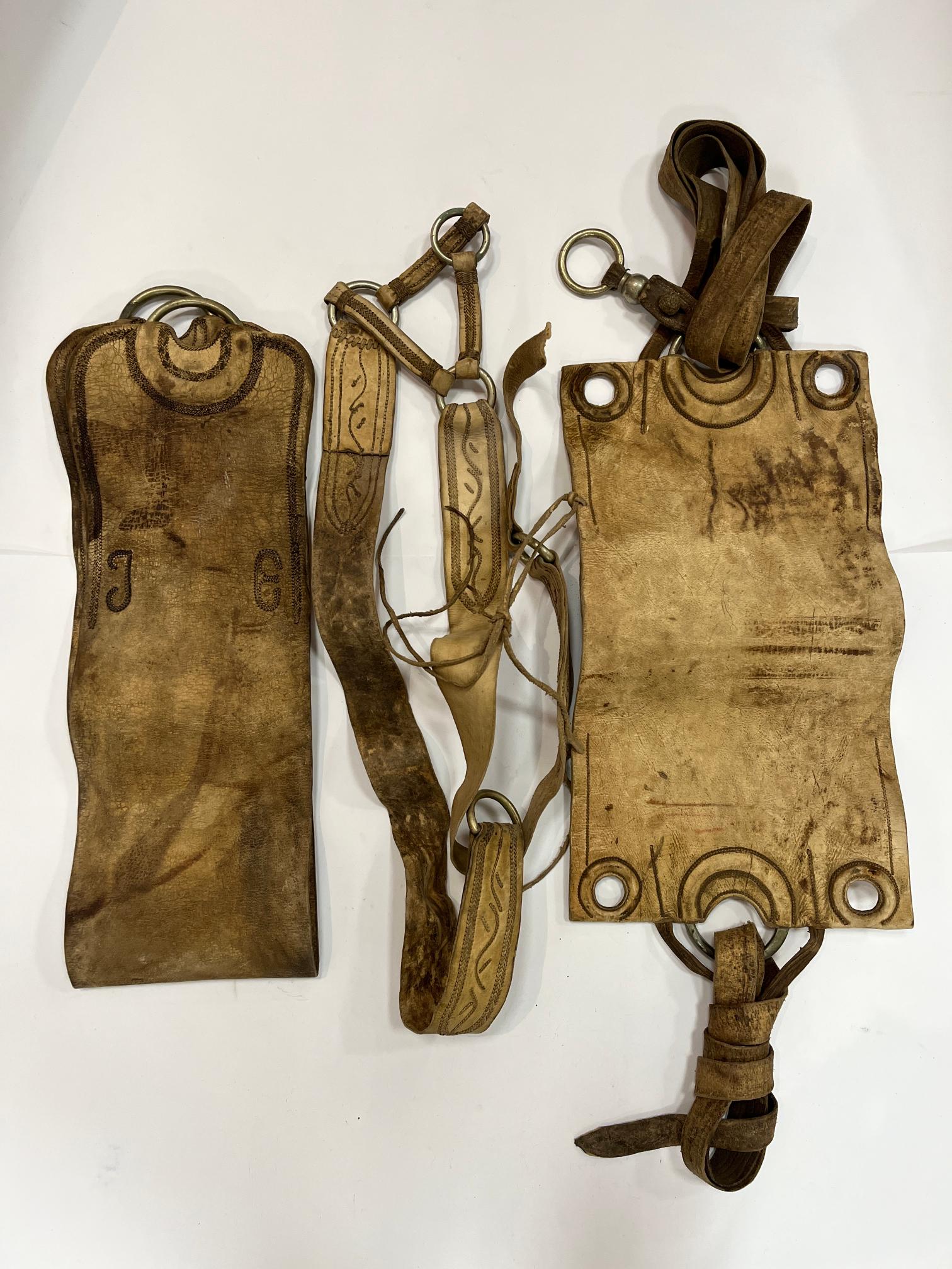 Conjunto de cincha, sobre cincha y pretal en cuero crudo, decorado en fino cuero bordado.
