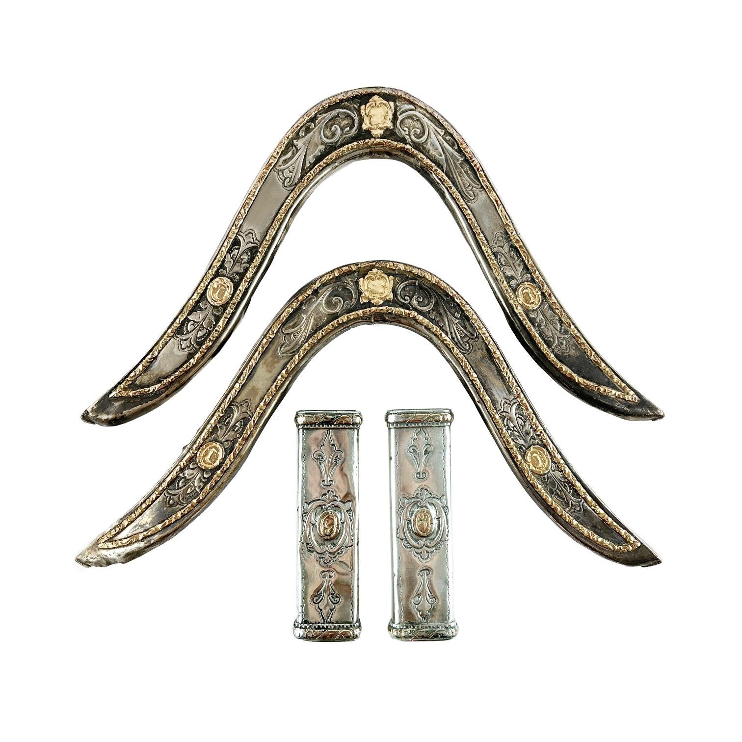 Conjunto de par de cabezadas de recado y par de pasadores en plata y oro cincelados «hojas y flores».