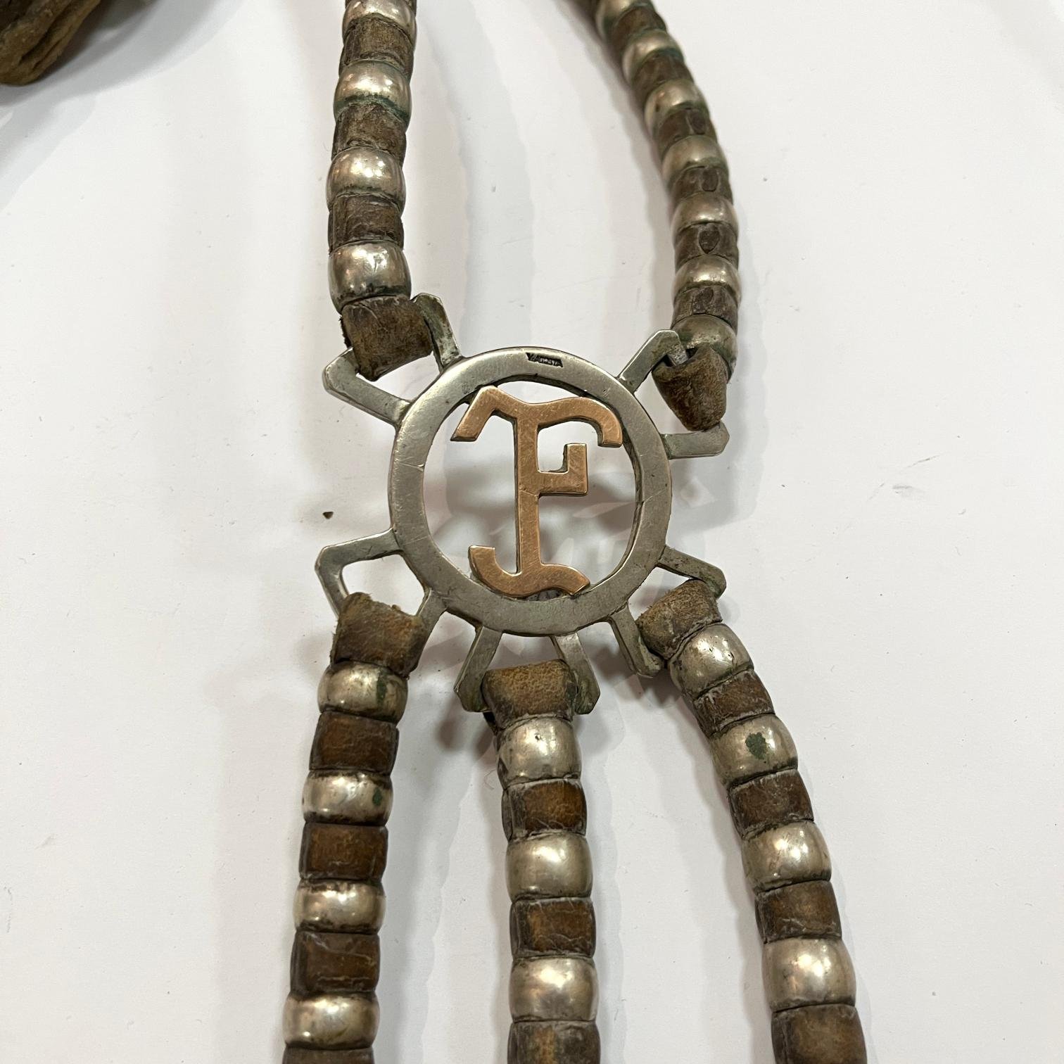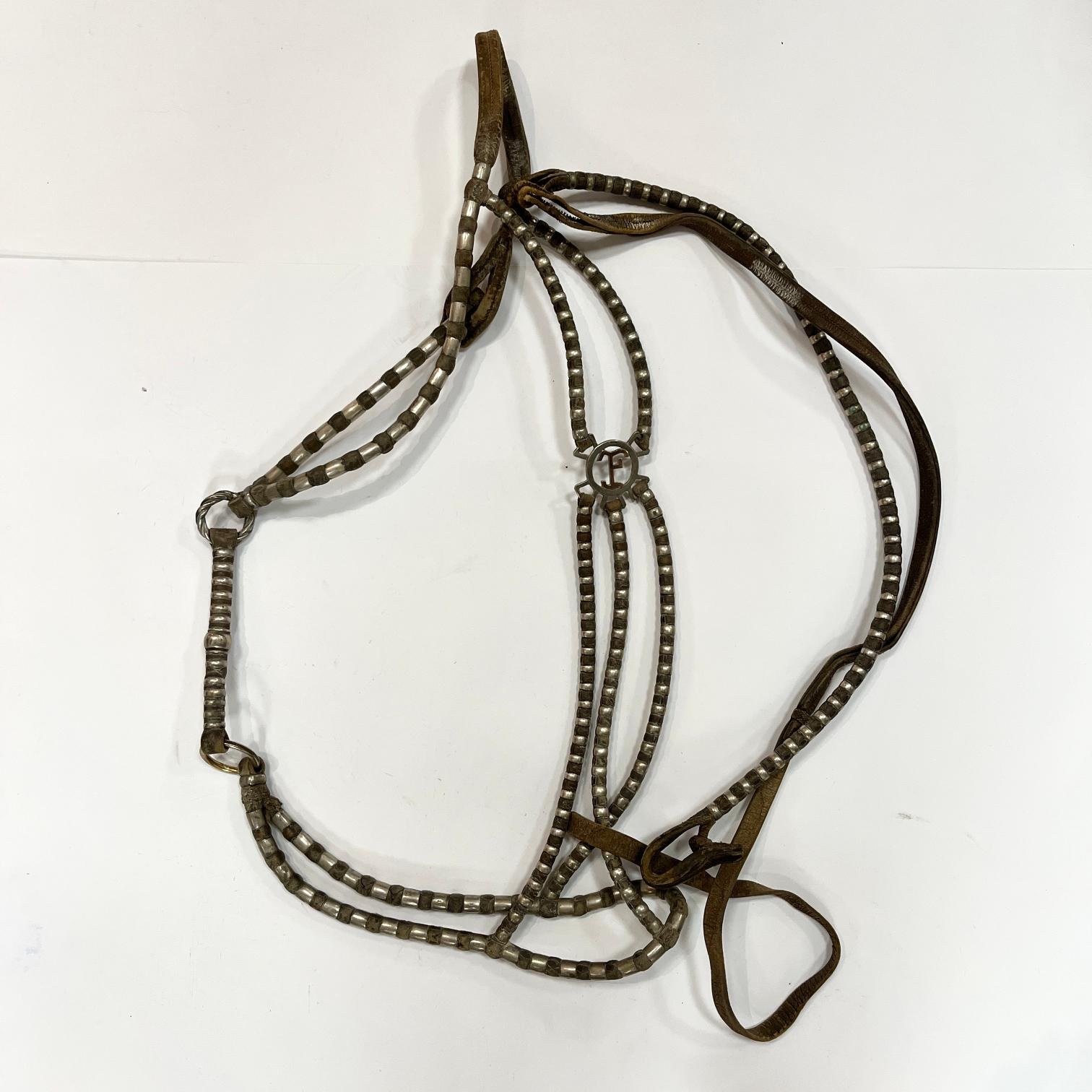 Conjunto de par de estribos, freno y bozal porteños. Compuesto por: par de estriberas en cuero crudo con estribos en plata lisa, decorados con marca de estancia «J.F.» en oro, y par de pasadores tipo tubo en plata lisa, de un largo de 23 cm. Freno en hierro forjado con pontezuela en plata calada y cincelada «hojas», con punzón del platero J. Benites, y copas en plata cincelada «flor», con punzón del platero Carón. Cabezada de freno en cuero crudo decorada con cincuenta y tres pasadores en plata lisa. Bozal en cuero crudo con ciento noventa y siete pasadores en plata lisa y medallón central en plata decorado con marca de estancia «J.F.» en oro. Con punzón del platero V. Acosta. Pequeña avería en cuero.