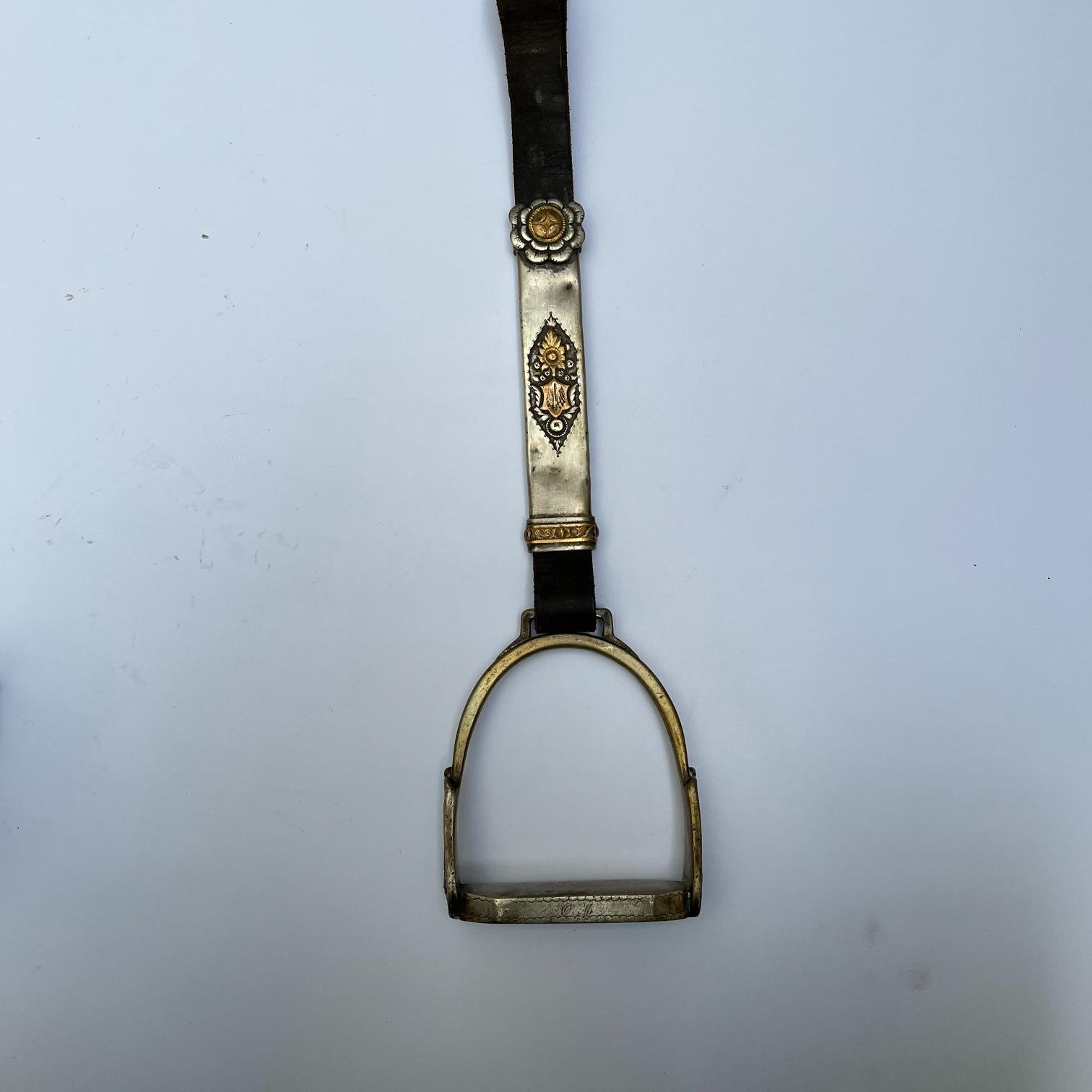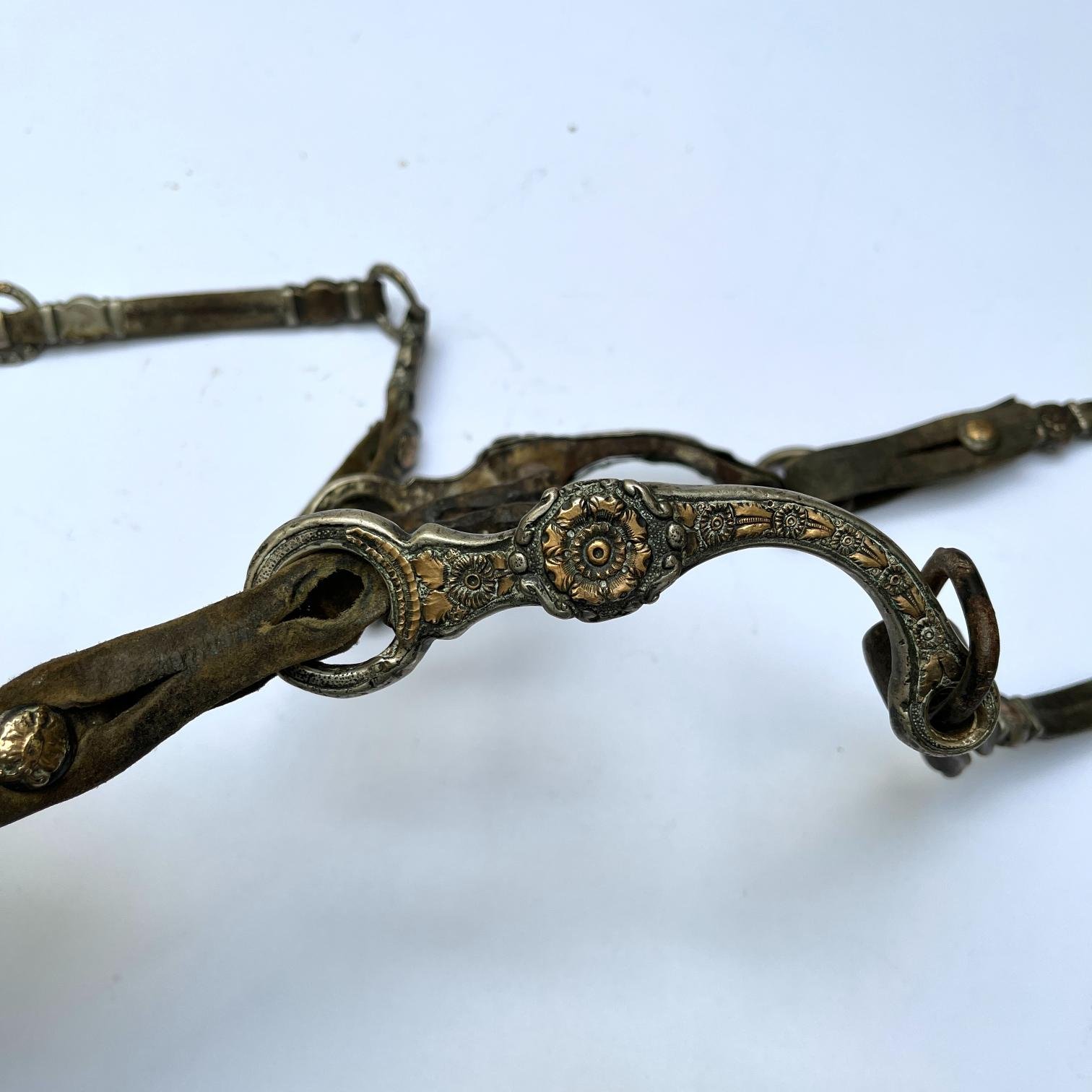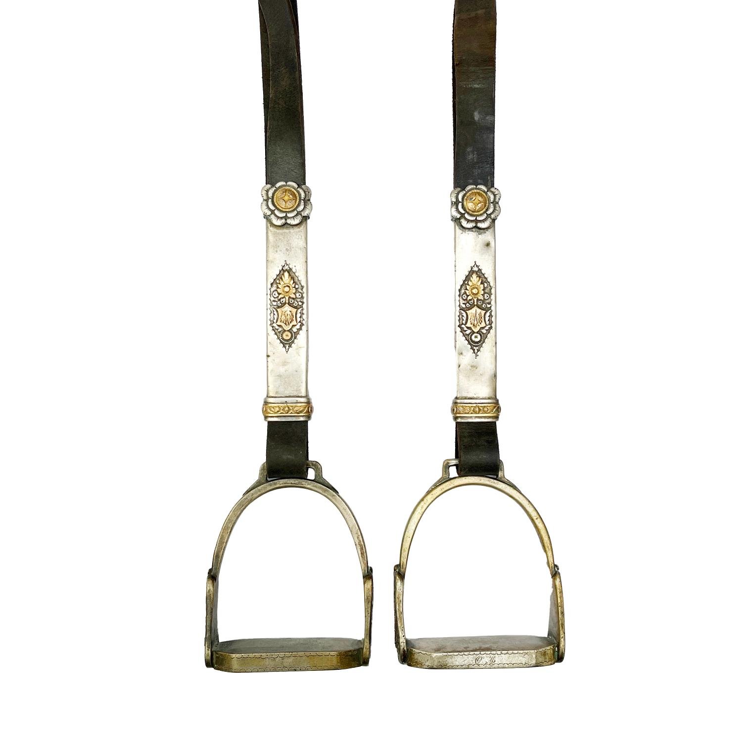 Conjunto de recado en cuero marrón repujado «flores», con sello de la talabartería «Brasilera». Compuesto por: cabezadas en plata y oro cinceladas «hojas y flores»; freno en hierro forjado, con patas forradas en plata y oro cinceladas «hojas y flores»; cabezada de freno en cuero crudo, con dieciséis pasadores dobles y plata y oro cincelados «mariposas», siete argollas en plata y oro cinceladas «flores» y un par de botones en plata y oro cincelados «mariposas»; par de riendas en cuero crudo, averiado, con seis pasadores en plata y oro cincelados «flores»; bozal en cuero crudo, con diecinueve pasadores en plata y oro cincelados «mariposas», argollas en metal blanco y un pasador tipo bomba; par de estriberas en cuero marrón, con par de estribos tipo ingleses en plata con laterales en oro cincelados «hojas», y par de pasadores chatos en plata y oro cincelados «hojas y flores”, de un largo de 16 cm.