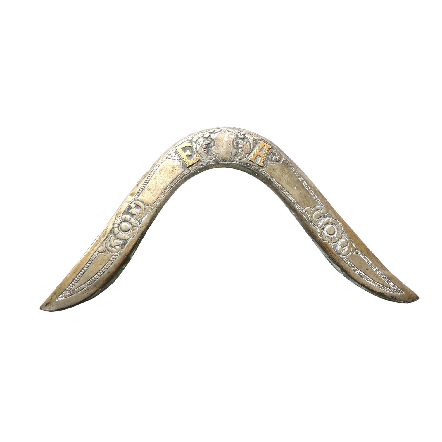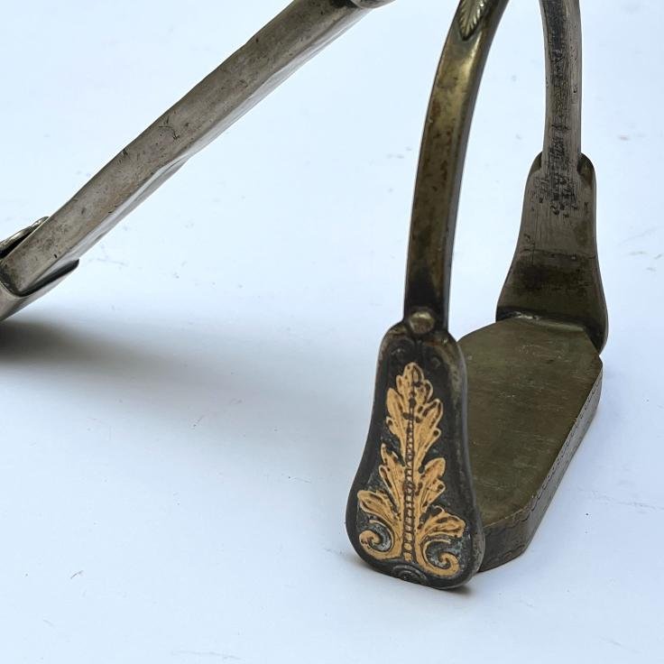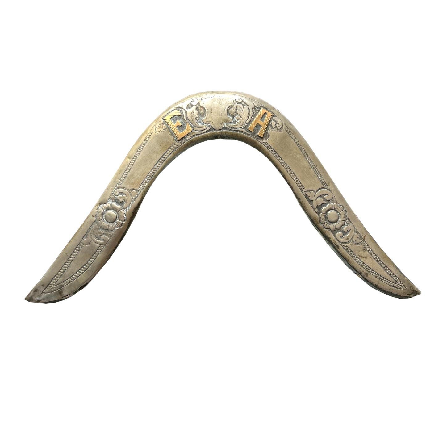 Conjunto de recado en cuero marrón repujado «flores», con sello de la talabartería «Brasilera». Compuesto por: cabezadas en plata y oro cinceladas «hojas y flores»; freno en hierro forjado, con patas forradas en plata y oro cinceladas «hojas y flores»; cabezada de freno en cuero crudo, con dieciséis pasadores dobles y plata y oro cincelados «mariposas», siete argollas en plata y oro cinceladas «flores» y un par de botones en plata y oro cincelados «mariposas»; par de riendas en cuero crudo, averiado, con seis pasadores en plata y oro cincelados «flores»; bozal en cuero crudo, con diecinueve pasadores en plata y oro cincelados «mariposas», argollas en metal blanco y un pasador tipo bomba; par de estriberas en cuero marrón, con par de estribos tipo ingleses en plata con laterales en oro cincelados «hojas», y par de pasadores chatos en plata y oro cincelados «hojas y flores”, de un largo de 16 cm.