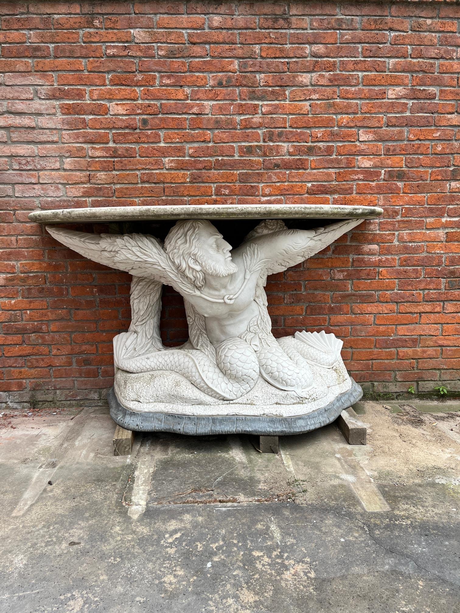 Consola en mármol blanco veteado con pie esculturado «tritón», sobre base en mármol negro. Alto 95 cm. Ancho 170 cm. Profundidad 75 cm.