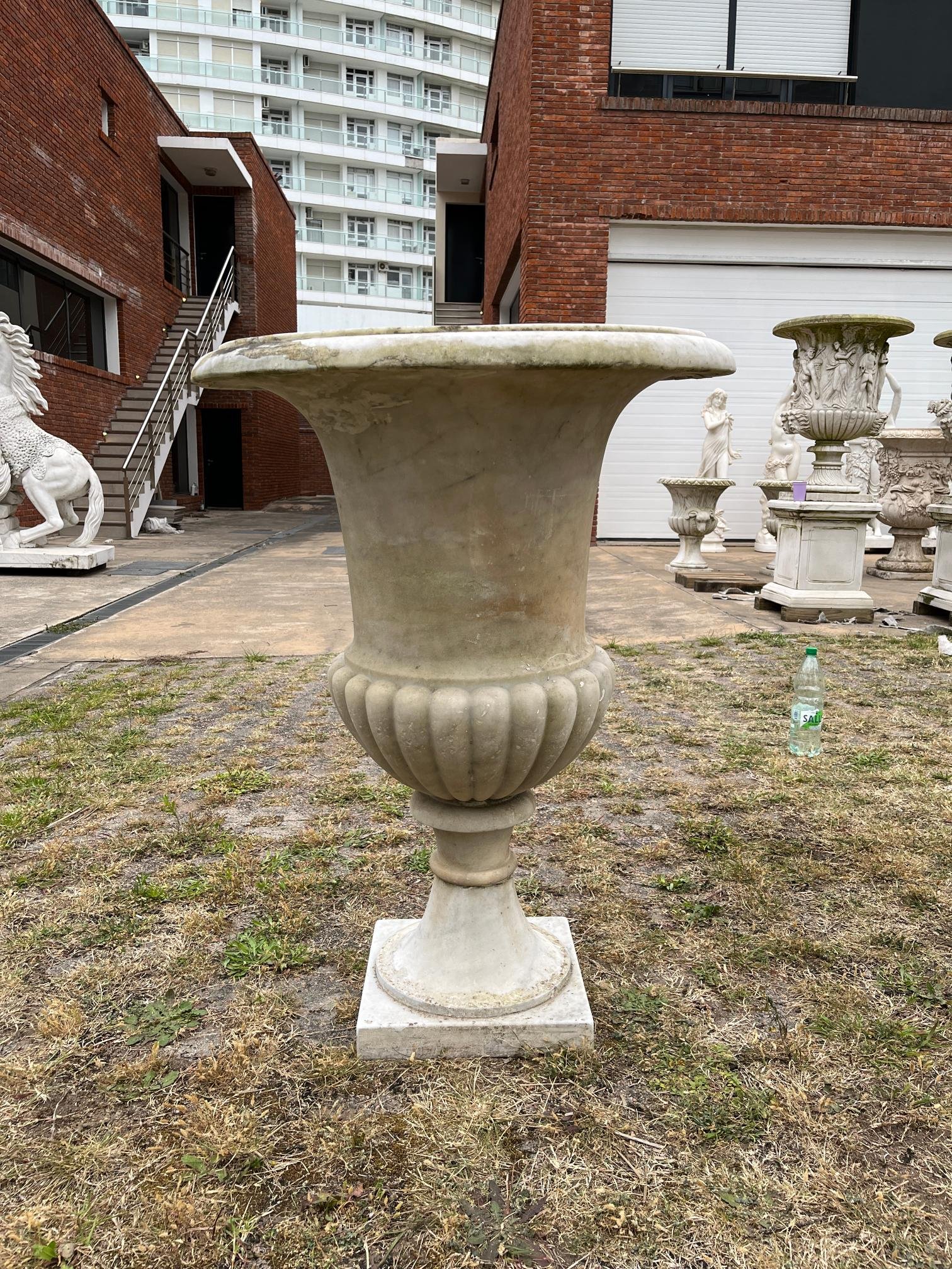 Copón en mármol blanco veteado, con friso lobulado. Alto 105. Diámetro 74 cm.