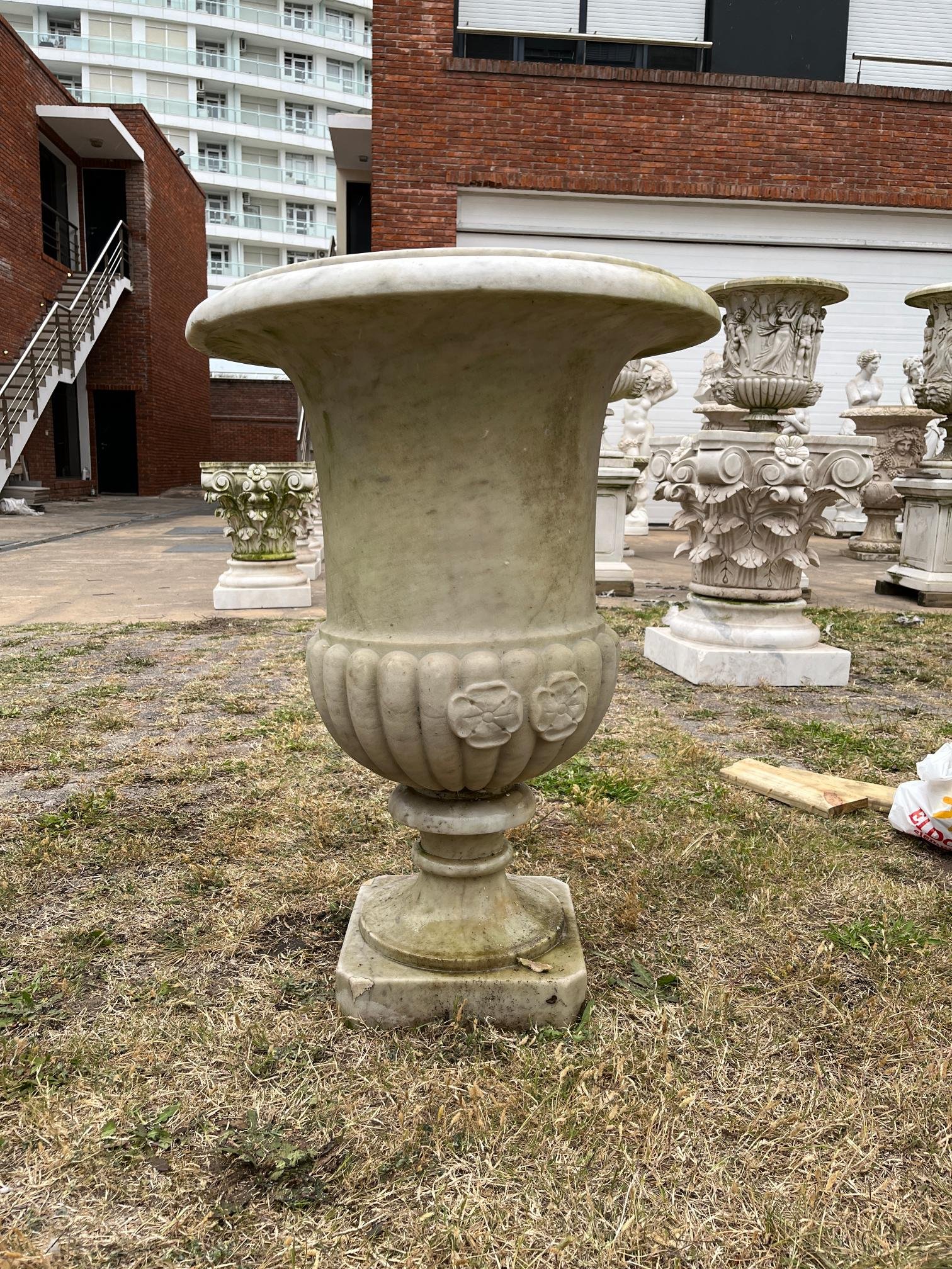 Copón en mármol blanco veteado, con friso lobulado y decorado “flores”. Alto 82. Diámetro 60 cm.