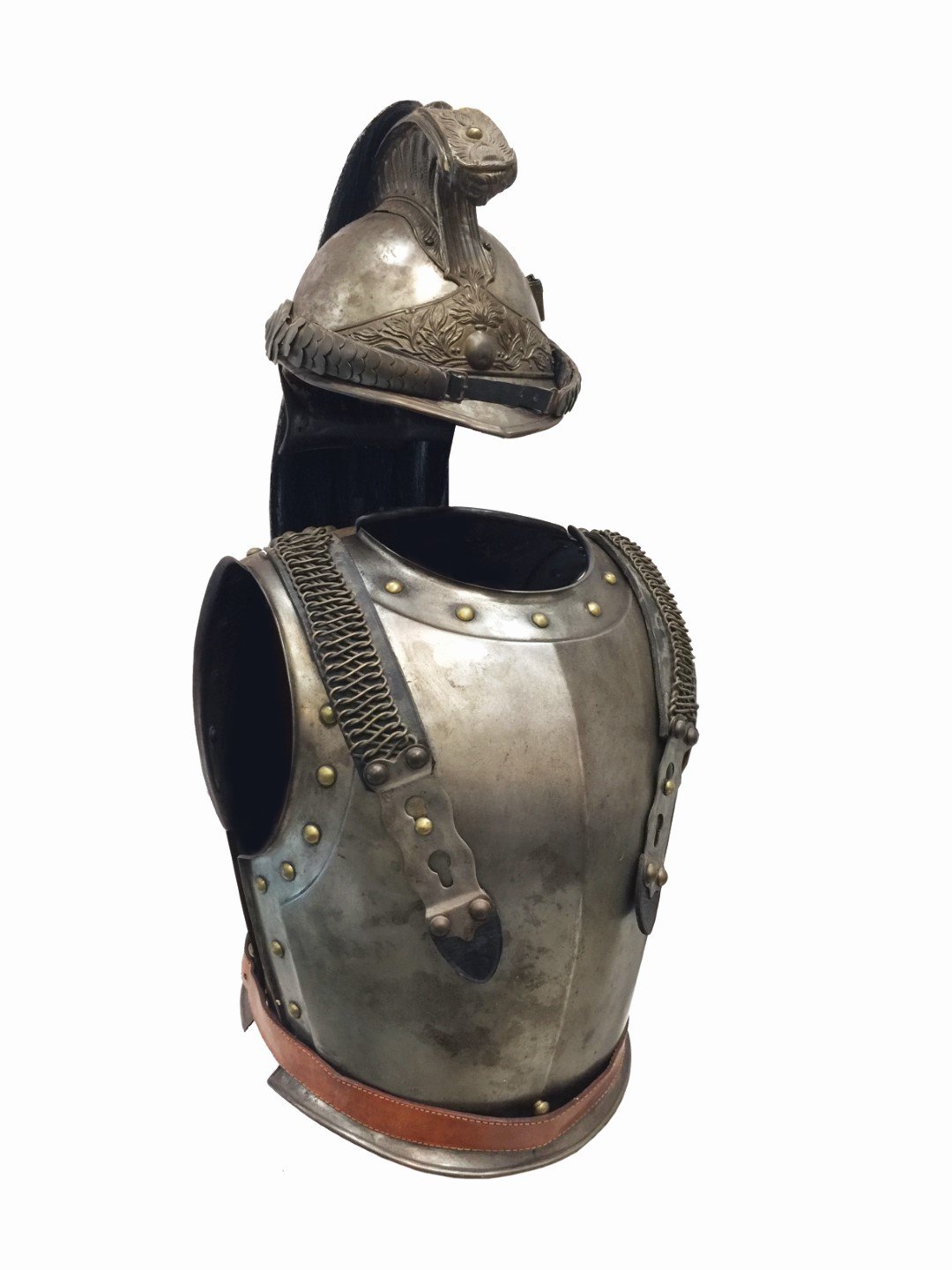 Conjunto de coraza y casco francés, en acero. Utilizado por el cuerpo de dragones. Coraza decorada con remaches en bronce y cinchas en cuero y bronce. Casco con monturas, cresta y carrilleras escamadas en bronce. Cresta decorada con crin negra. Interior de casco incompleto.