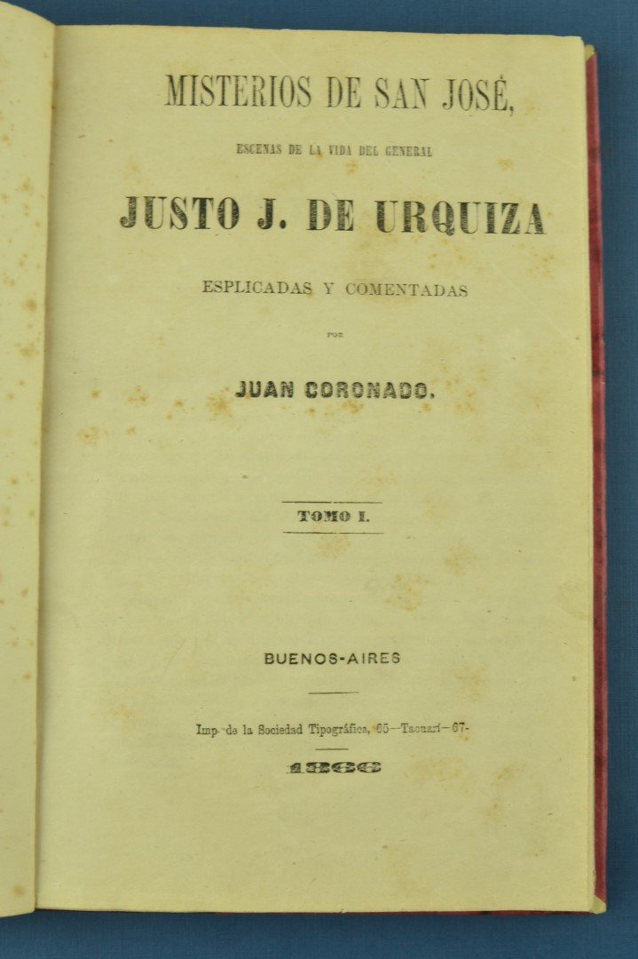 CORONADO, Juan: Misterios de San José Escenas de la vida del General Justo J. de Urquiza. Buenos Aires, Imprenta de la Sociedad Tipográfica. 1866. Dos tomos en un volumen. Encuadernación moderna con lomo de cuero.