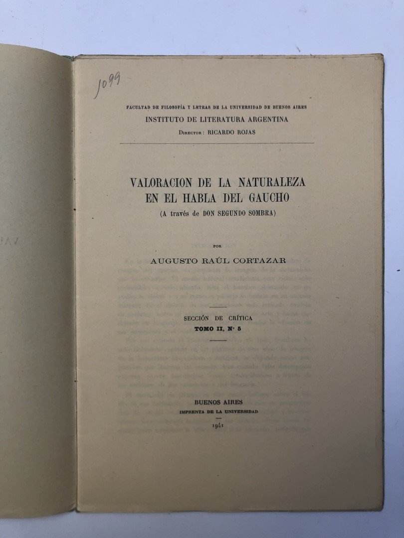 CORTAZAR, Augusto: Valoración de la naturaleza en el habla del gaucho. Tomo 2. Número 5. Buenos Aires, Imprenta de la Universidad. 1941. Encuadernación rústica del editor.