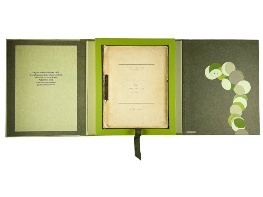 ¡Excepcional! Cuarenta y seis relatos breves, mecanoscritos originales de este consagrado autor. Treinta y cinco de ellos fueron publicados casi sin variantes en la primera edición de Historias de cronopios y famas (Buenos Aires, Ed. Minotauro, 1962); otros cuatro salieron a la luz en distintas publicaciones posteriores, y siete de ellos, de acuerdo a los estudios realizados, permanecen aún inéditos. En 4° (28,5 x 22,8 cm), 60 hojas -todas escritas en una sola cara. El original, en muy buen estado, se entrega conservado en una caja hecha “ad hoc” con materiales de conservación patrimonial.