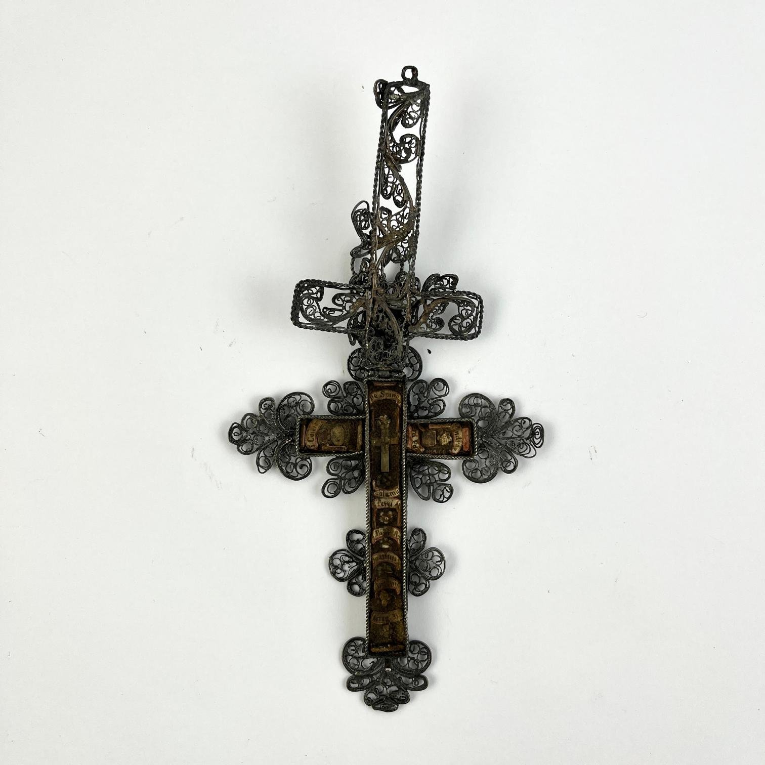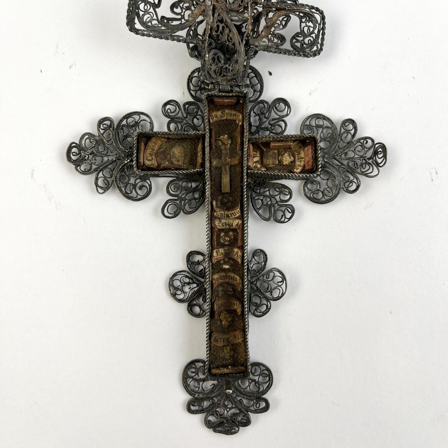 Crucifijo con relicario, s. XVIII, en filigrana de plata. Interior con varias reliquias. 14 x 10 cm.