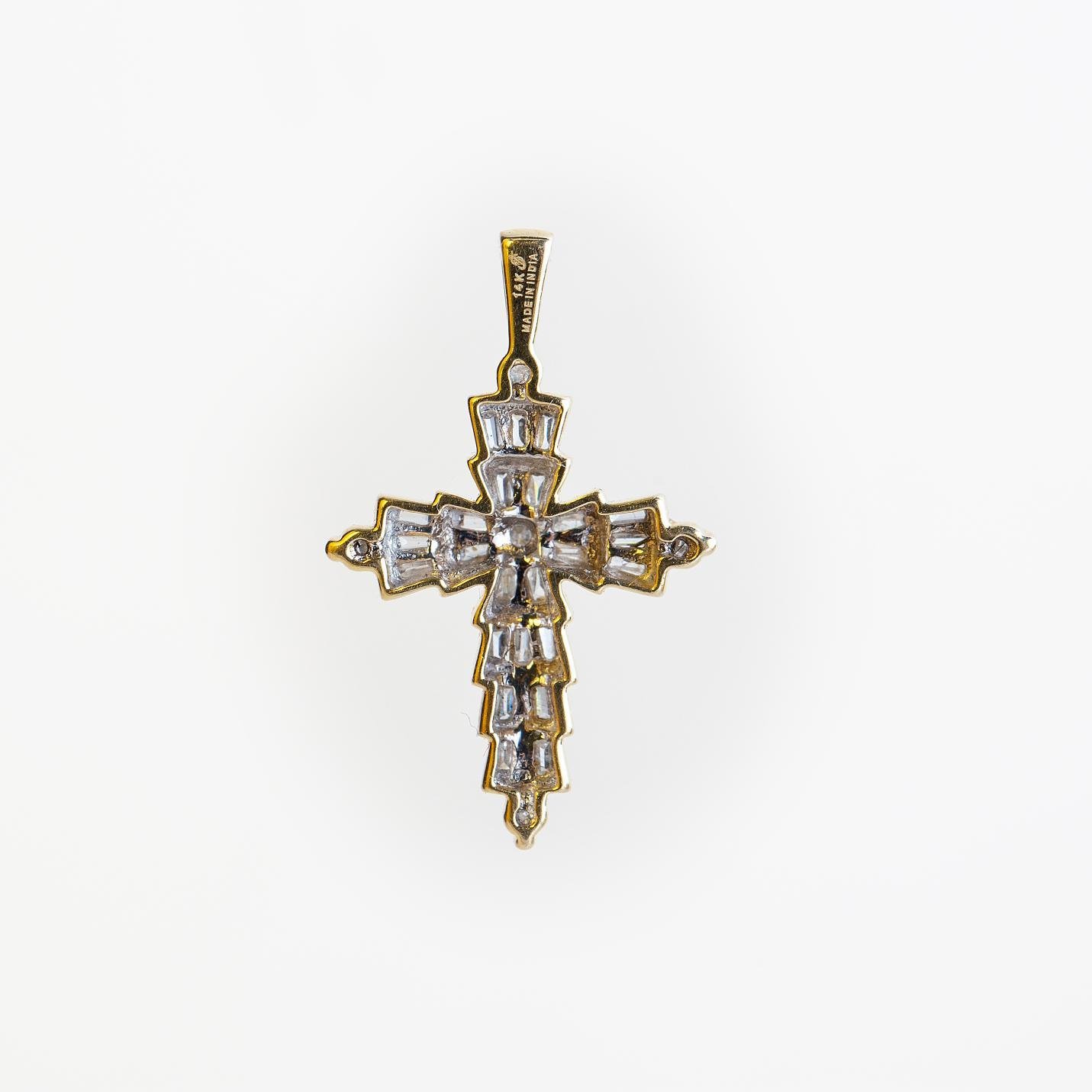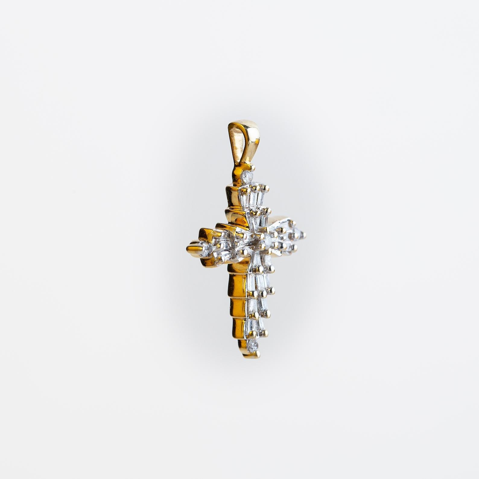 Cruz en oro 14 K amarillo totalmente decorada con cuatro pequeños brillantes y veinte diamantes talla baguette. 25 x 16 mm. Peso bruto 2 gr.
