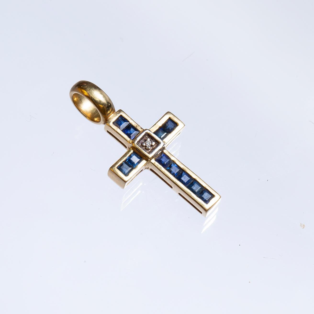 Cruz en oro 18 K amarillo con un pequeño diamante central talla brillante y once pequeños zafiros. 27 x 8,5 mm. Peso bruto 2,5 gr.