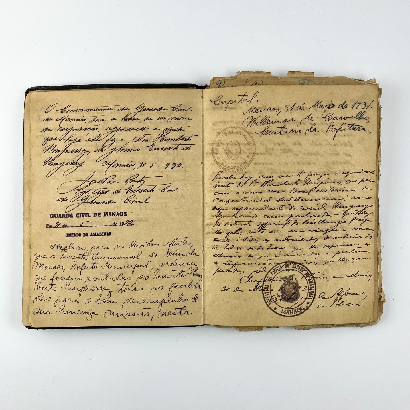 Cuaderno con «Firmas de las autoridades», perteneciente al Tte. Explorador Uruguayo Humberto Umpiérrez, conteniendo múltiples inscripciones, firmas y sellos húmedos en las que se deja constancia de la presencia de Umpiérrez en diversas instituciones militares y diplomáticas en Brasil, Venezuela y Colombia. Treinta y siete páginas (varias desprendidas) encuadernadas en cuero, con letras estampadas en oro en la portada.