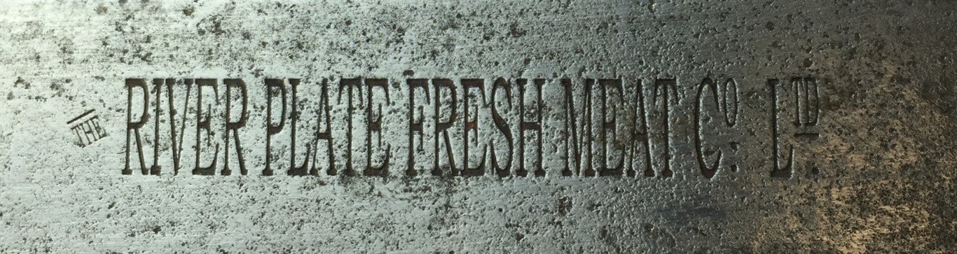Cuchilla fabricada por Joseph Rodgers, hoja marcada por «The River Plate Fresh Meat C°. Ltd.». Cachas en madera lisa, remaches en bronce. Largo total 35 cm. Con vaina en cuero crudo.