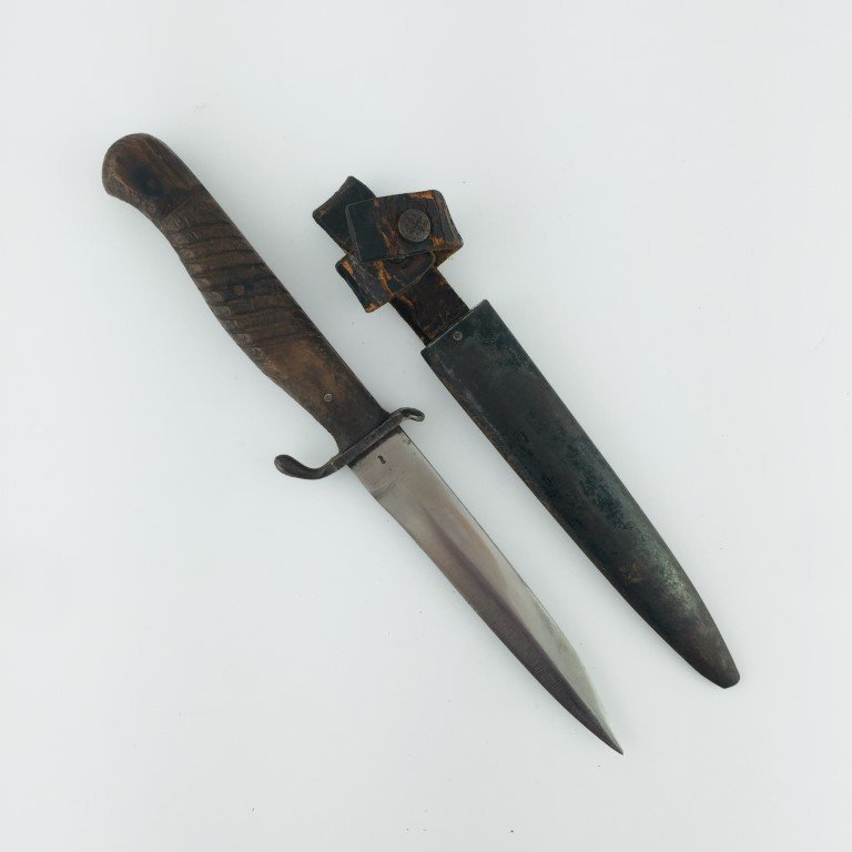 Cuchillo alemán de trinchera época WWI. Hoja con marca de fabricante no identificado. Cabo en madera tallada. Gavilán en hierro forjado. Vaina original en hierro y cuero.