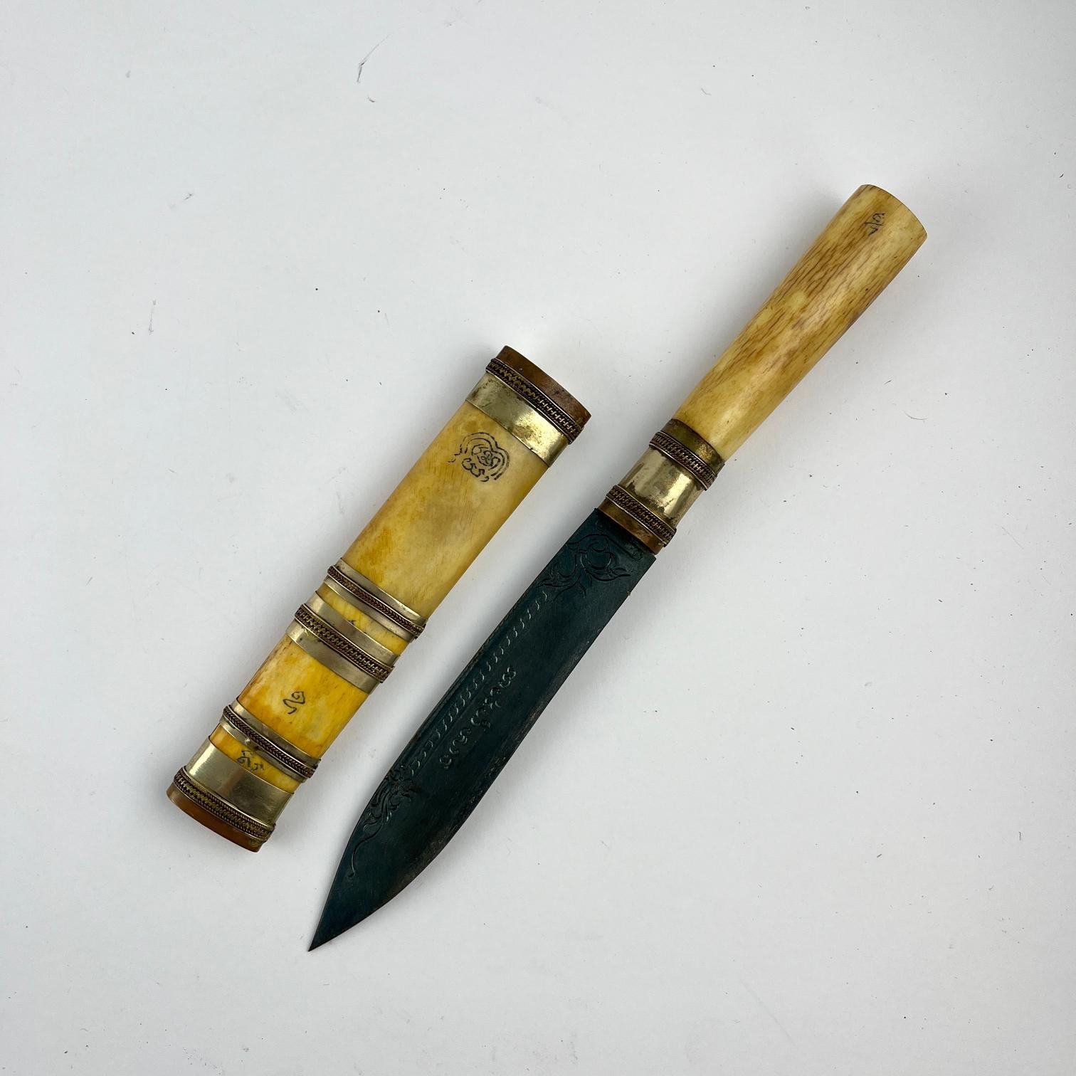 Cuchillo del sudeste asiático. Hoja cincelada. Cabo y vaina en hueso y metal. Largo total 23 cm.