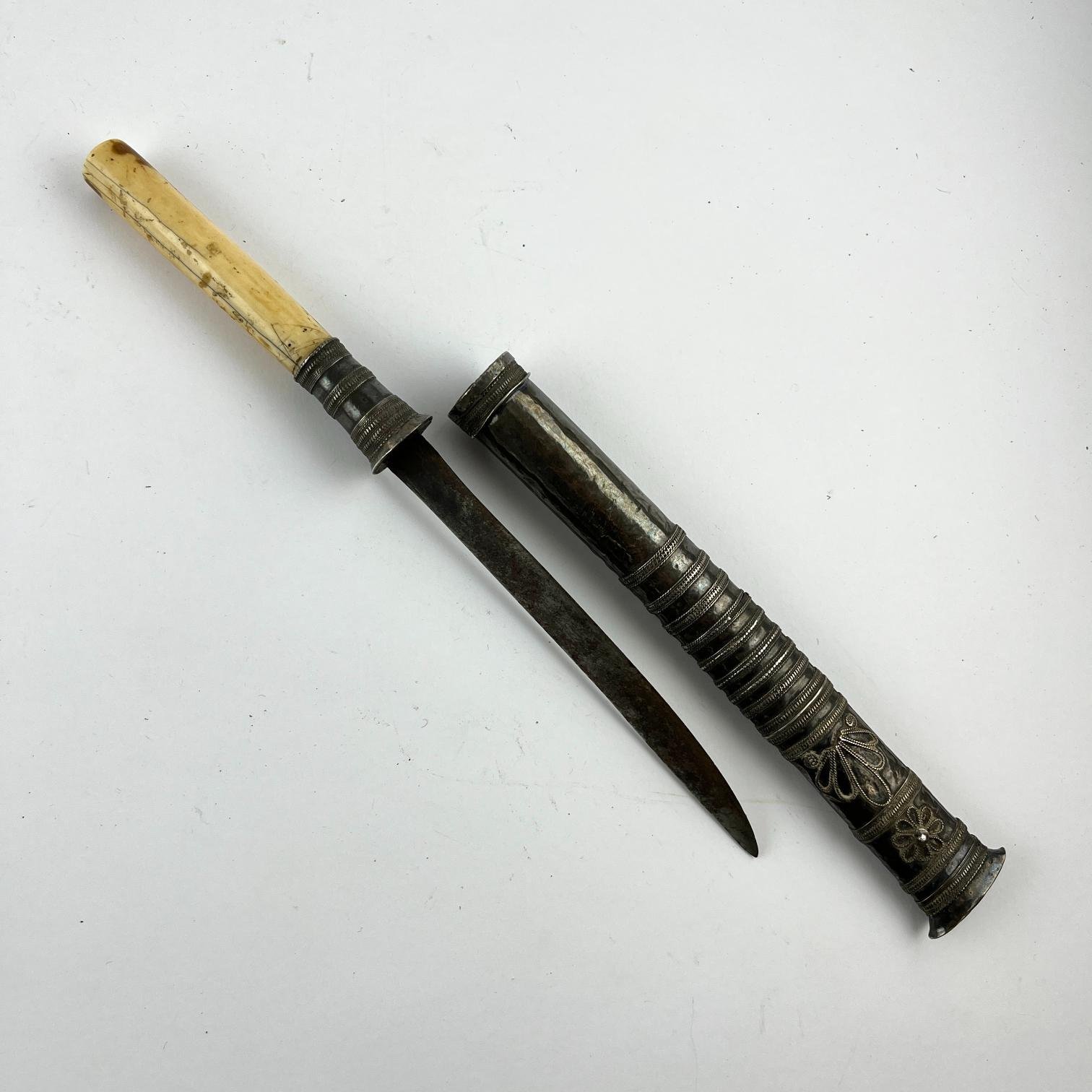 Cuchillo birmano dha, s. XIX. Cabo en marfil y plata. Vaina en plata lisa y filigrana. Largo total 30 cm.