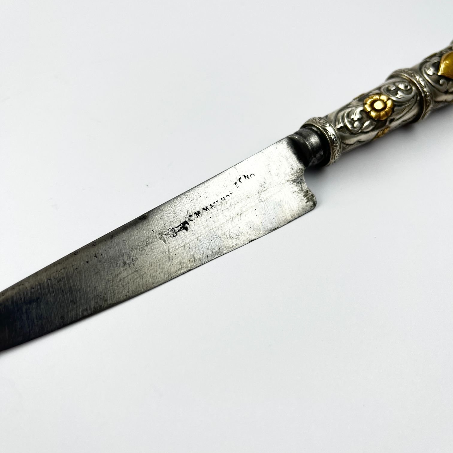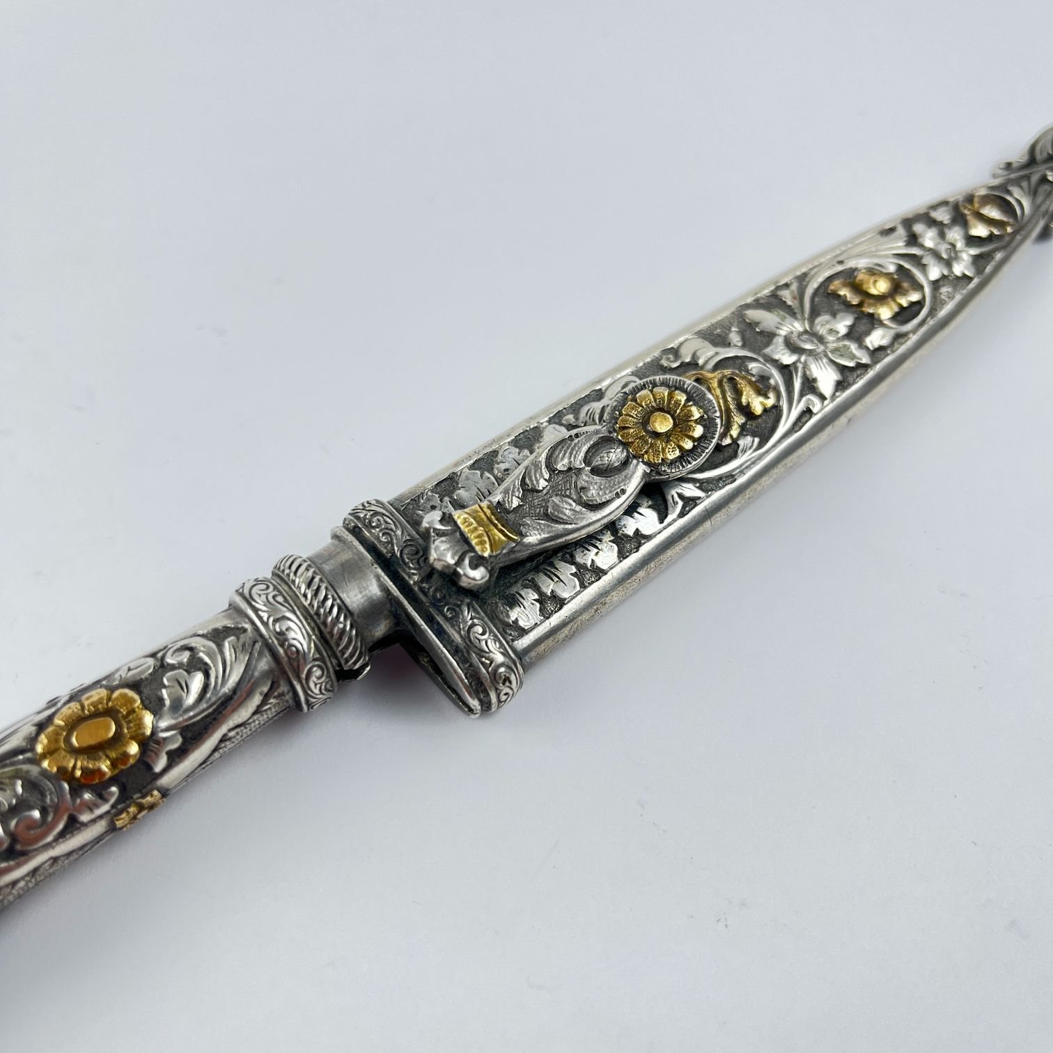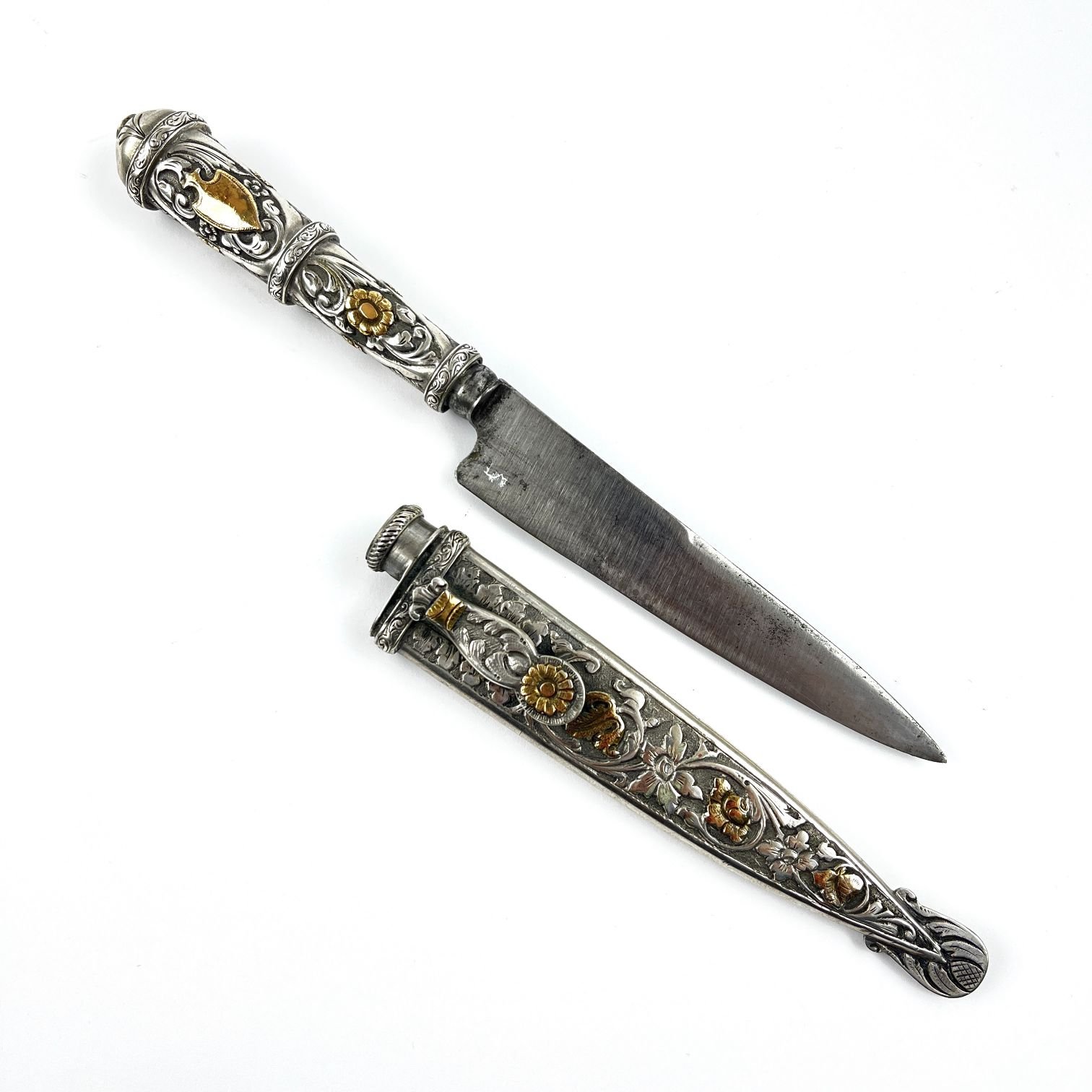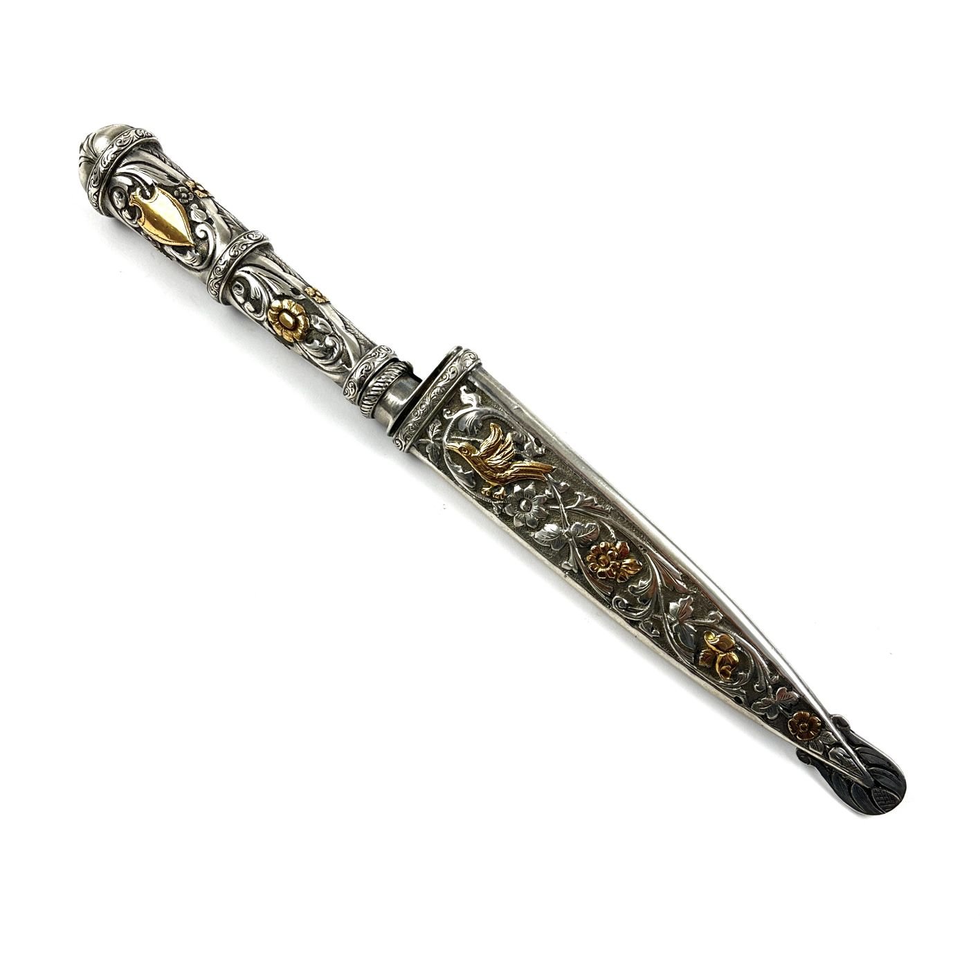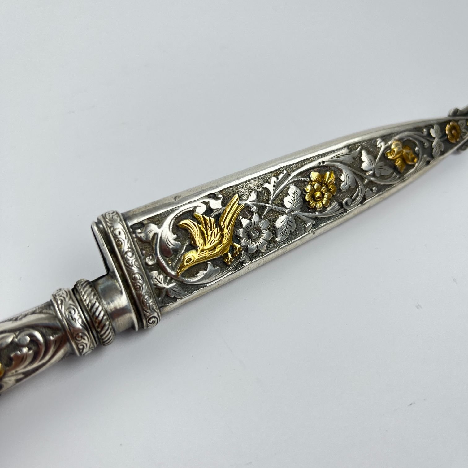 Cuchillo criollo verijero. Hoja «Cazador al Filo» de J. M. Mailhos. Cabo y vaina en plata y oro cincelados «hojas, flores y aves». Largo total 22 cm.
