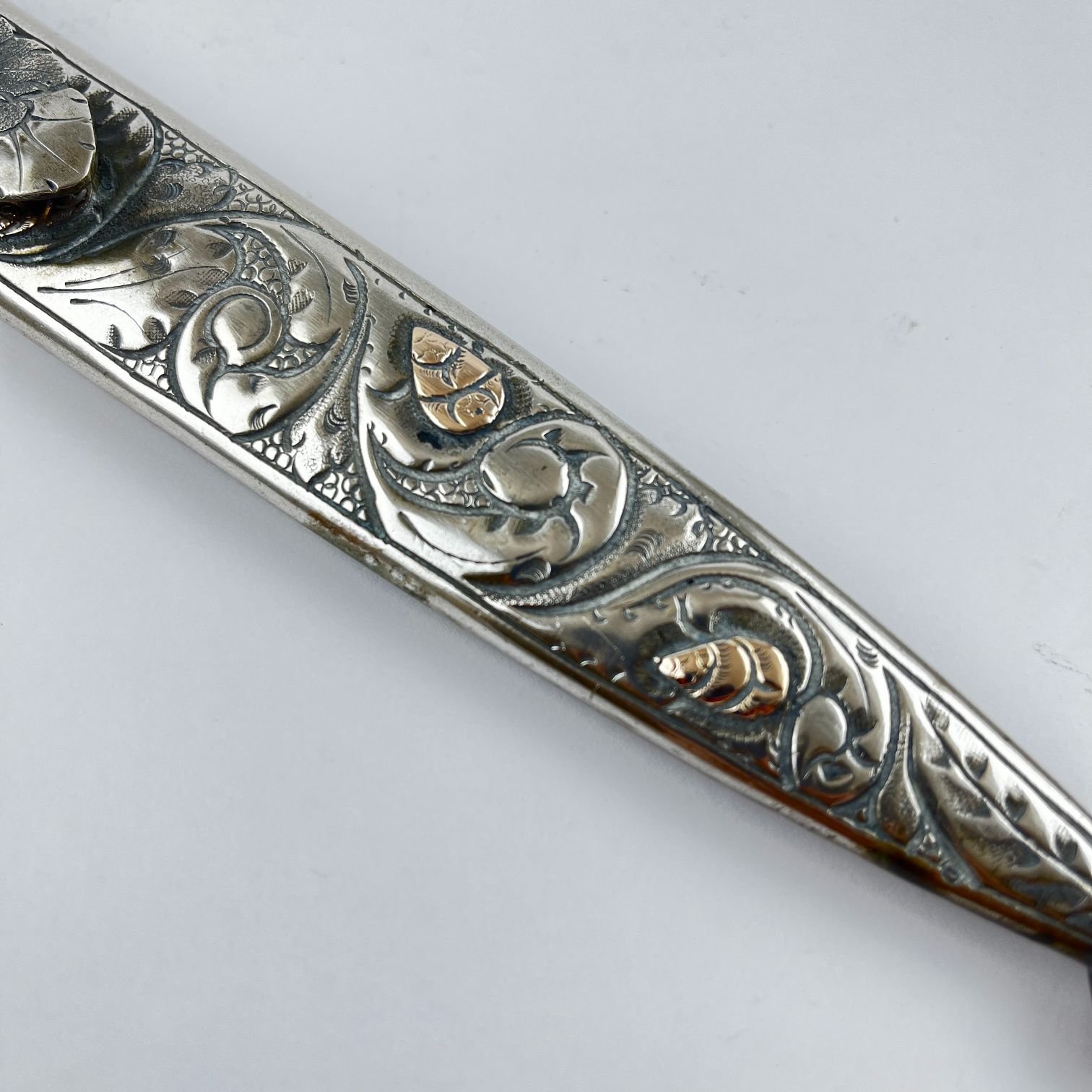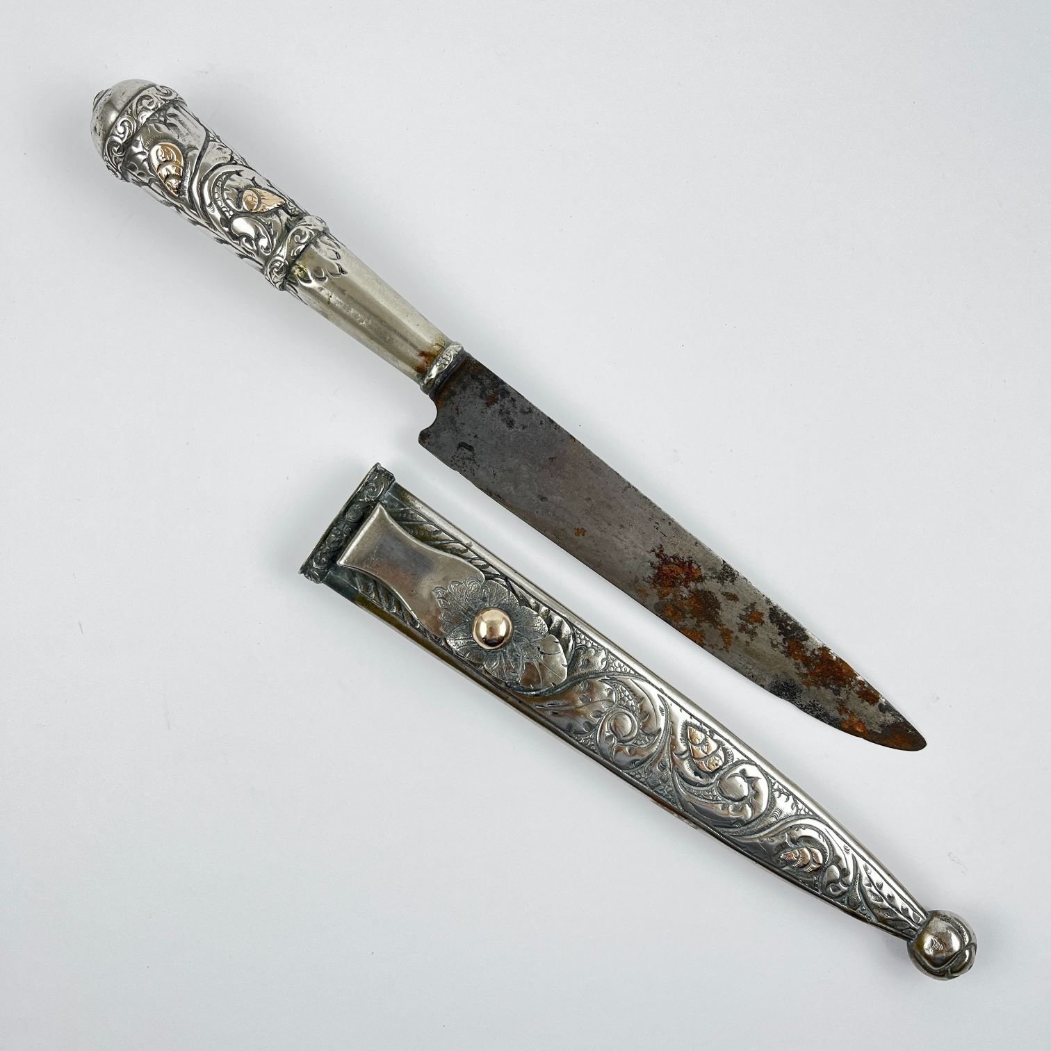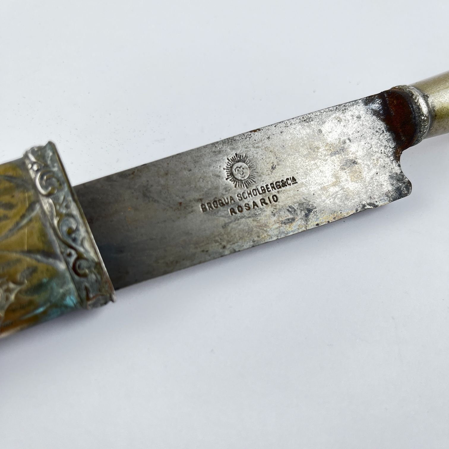 Cuchillo criollo. Hoja “Sol” de Broqua, Scholberg & Cía, Rosario. Cabo y vaina en plata y oro cincelados «hojas y flores». Largo total 32 cm.