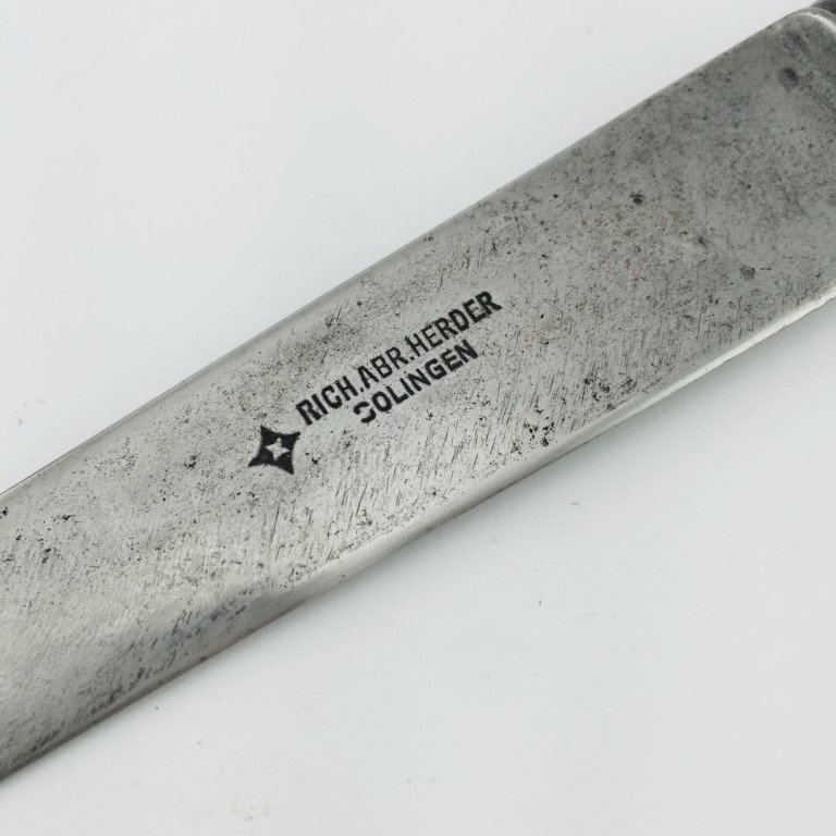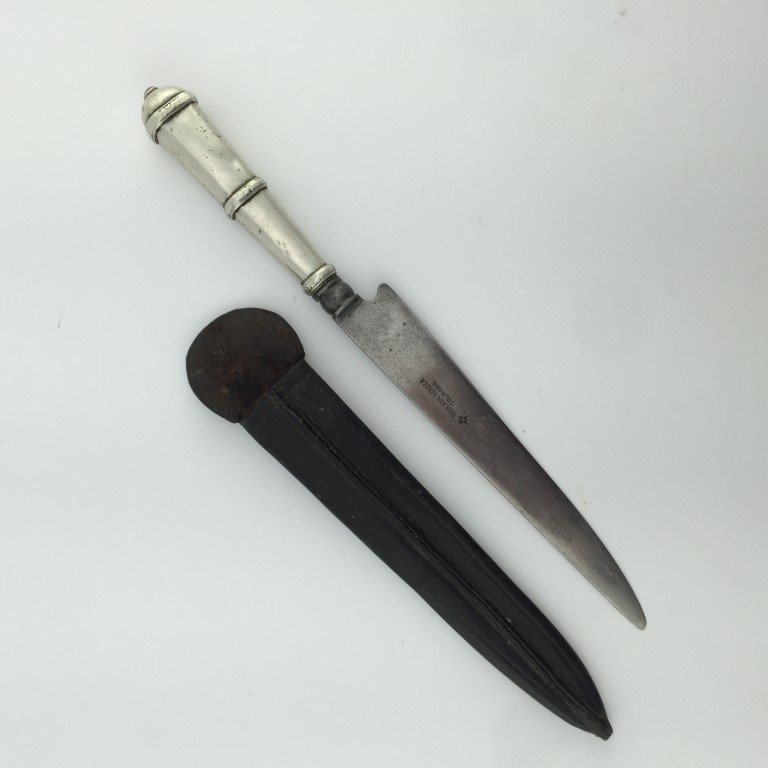 Cuchillo criollo. Hoja «Herder», Solingen. Cabo cuadrado en plata lisa, con sello del platero C.R. Ferrero. Largo total 29 cm. Vaina en cuero negro.