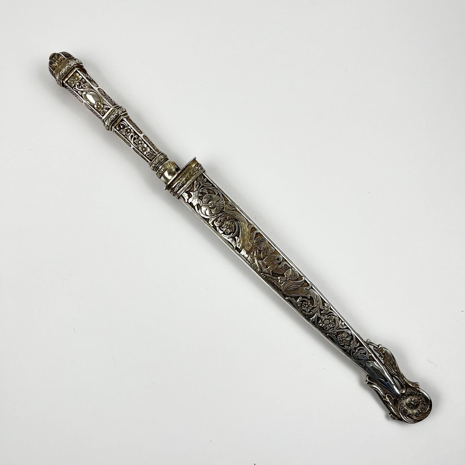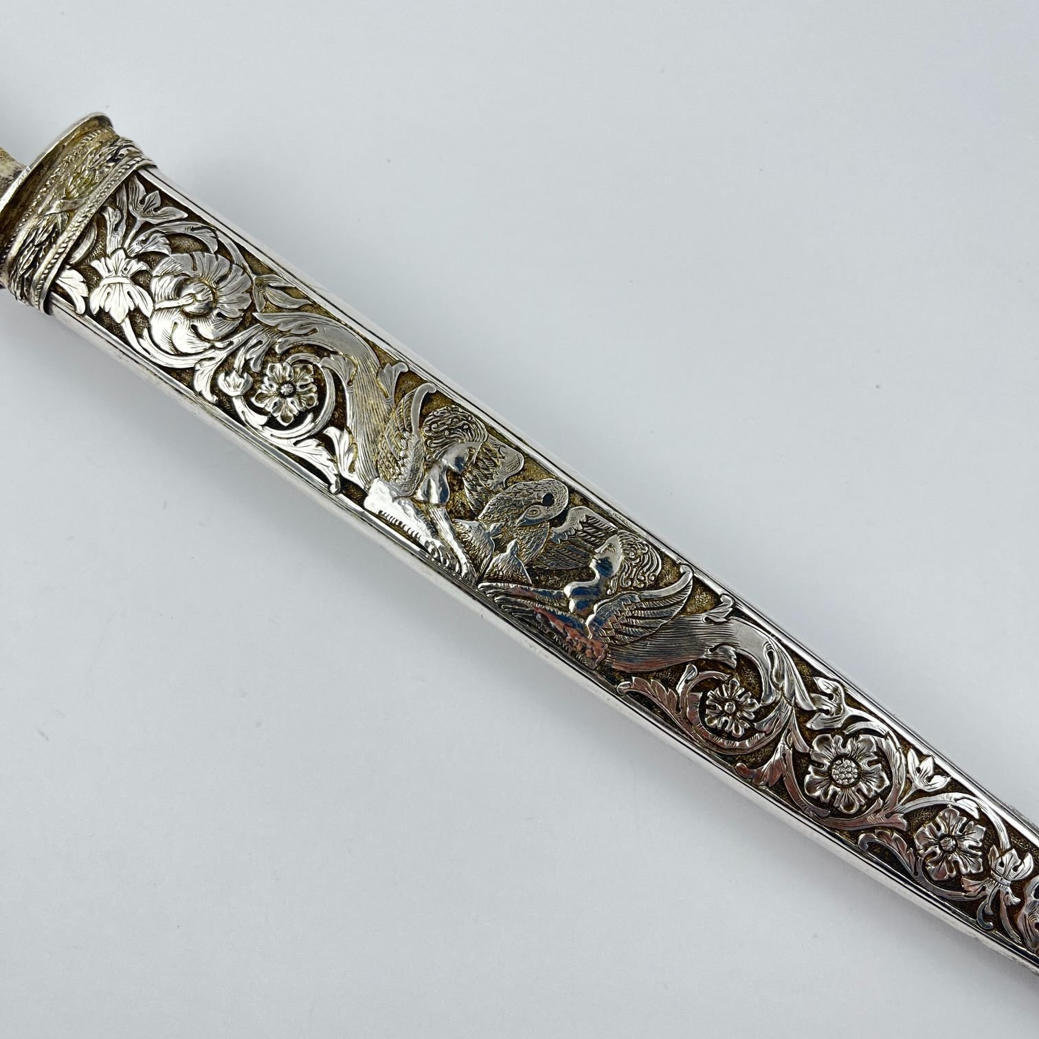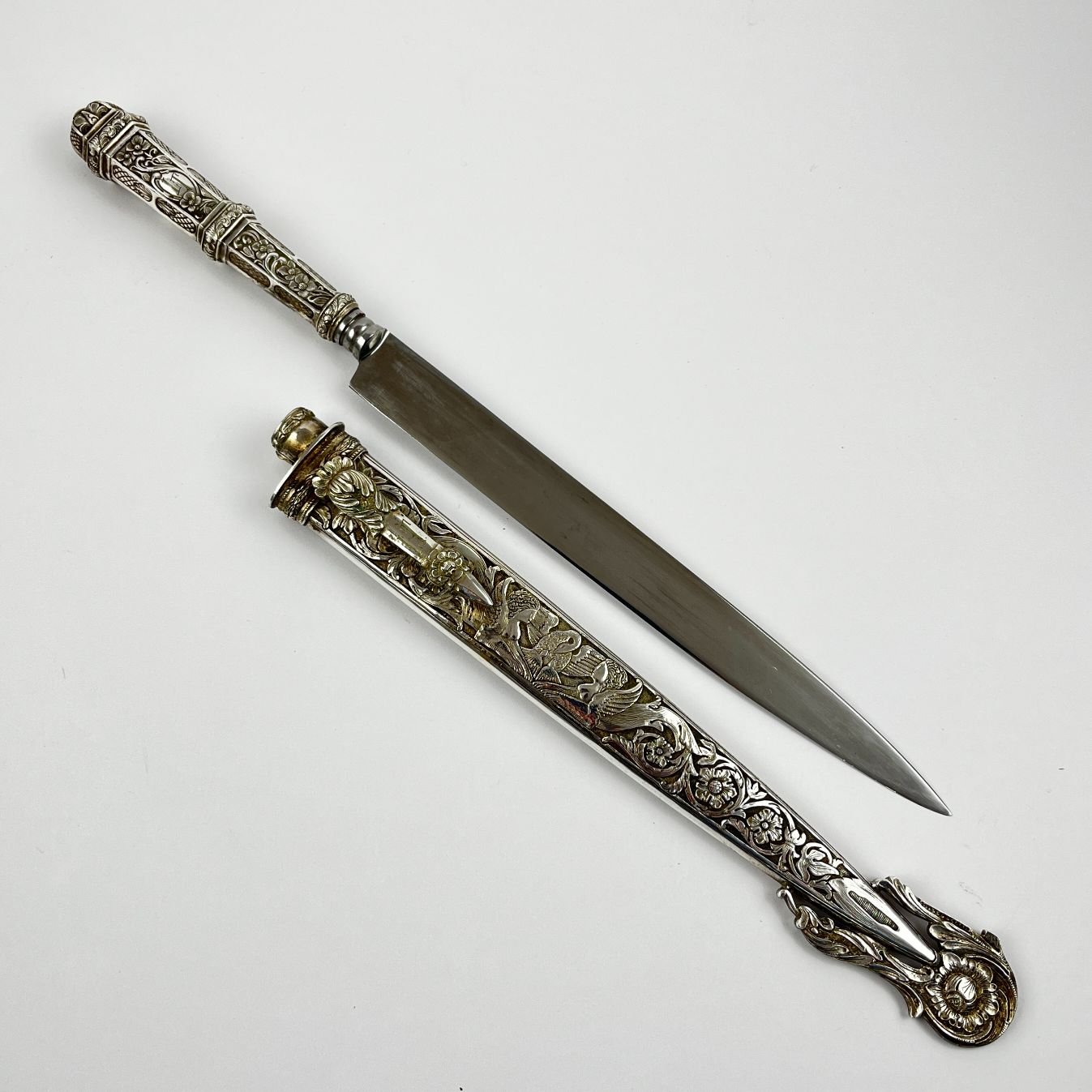 Cuchillo criollo riograndense. Hoja “Corneta” en acero inoxidable. Cabo y vaina en plata cincelados «hojas, flores y aves». Cabo grabado con iniciales «L.T.» Largo total 35 cm. En estuche original.