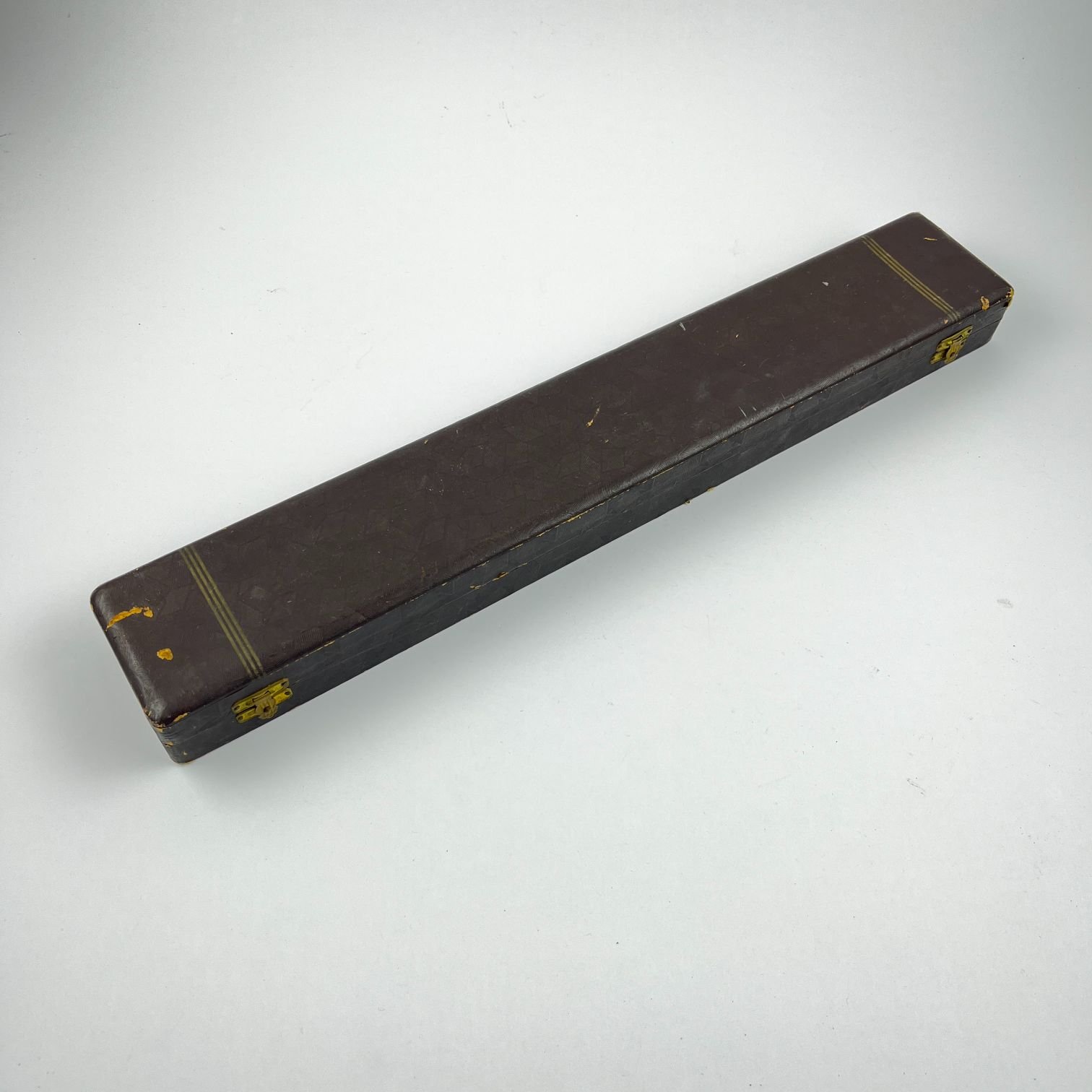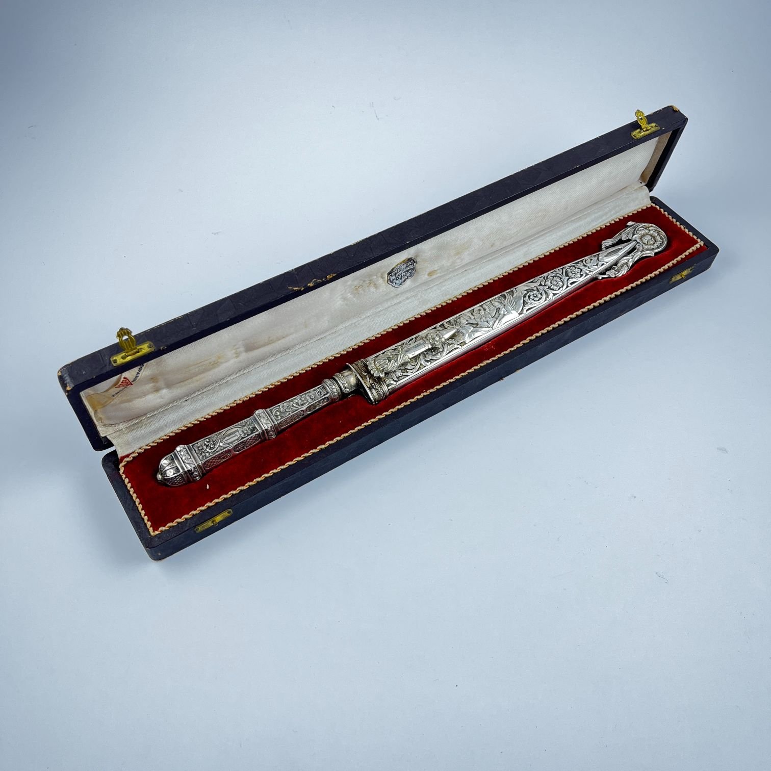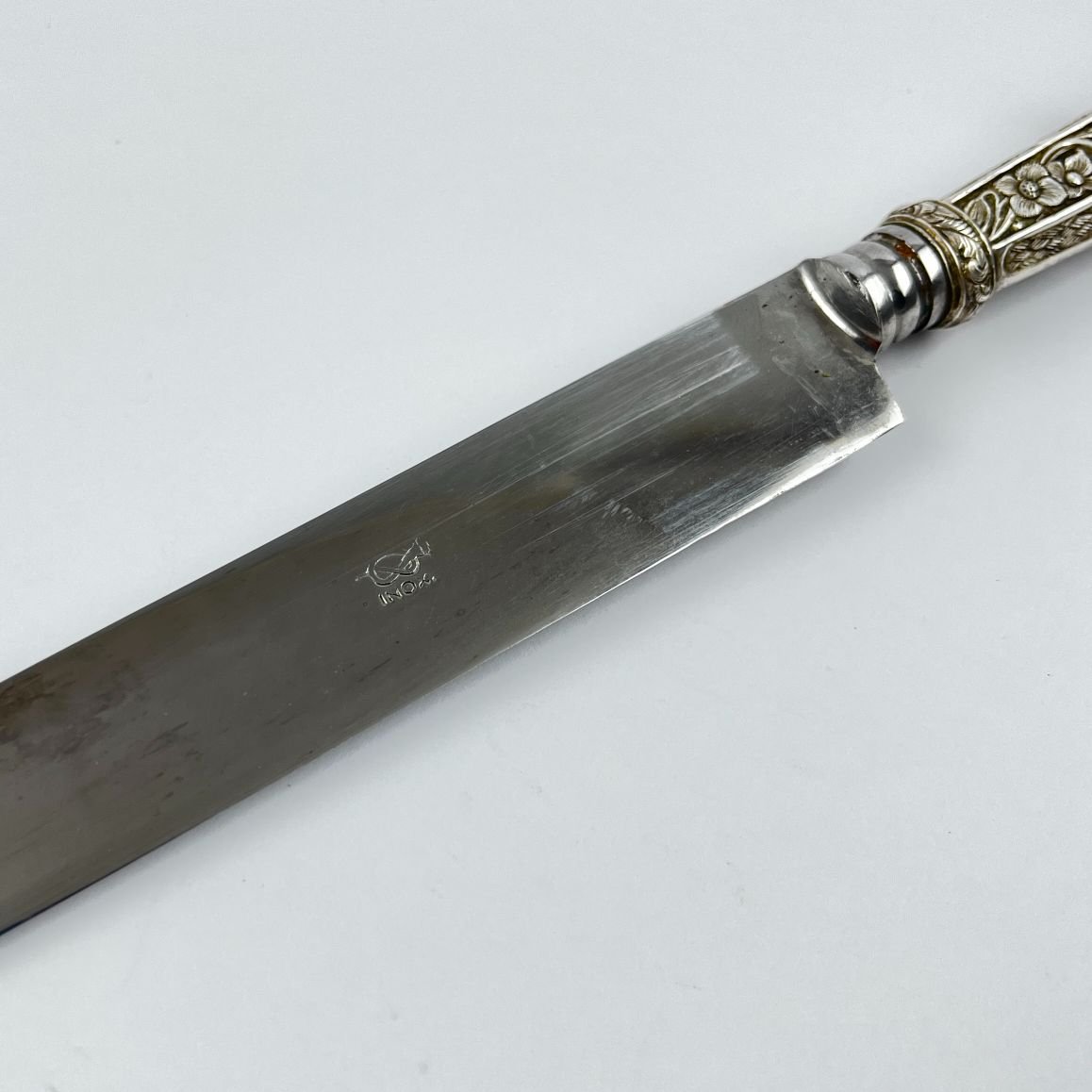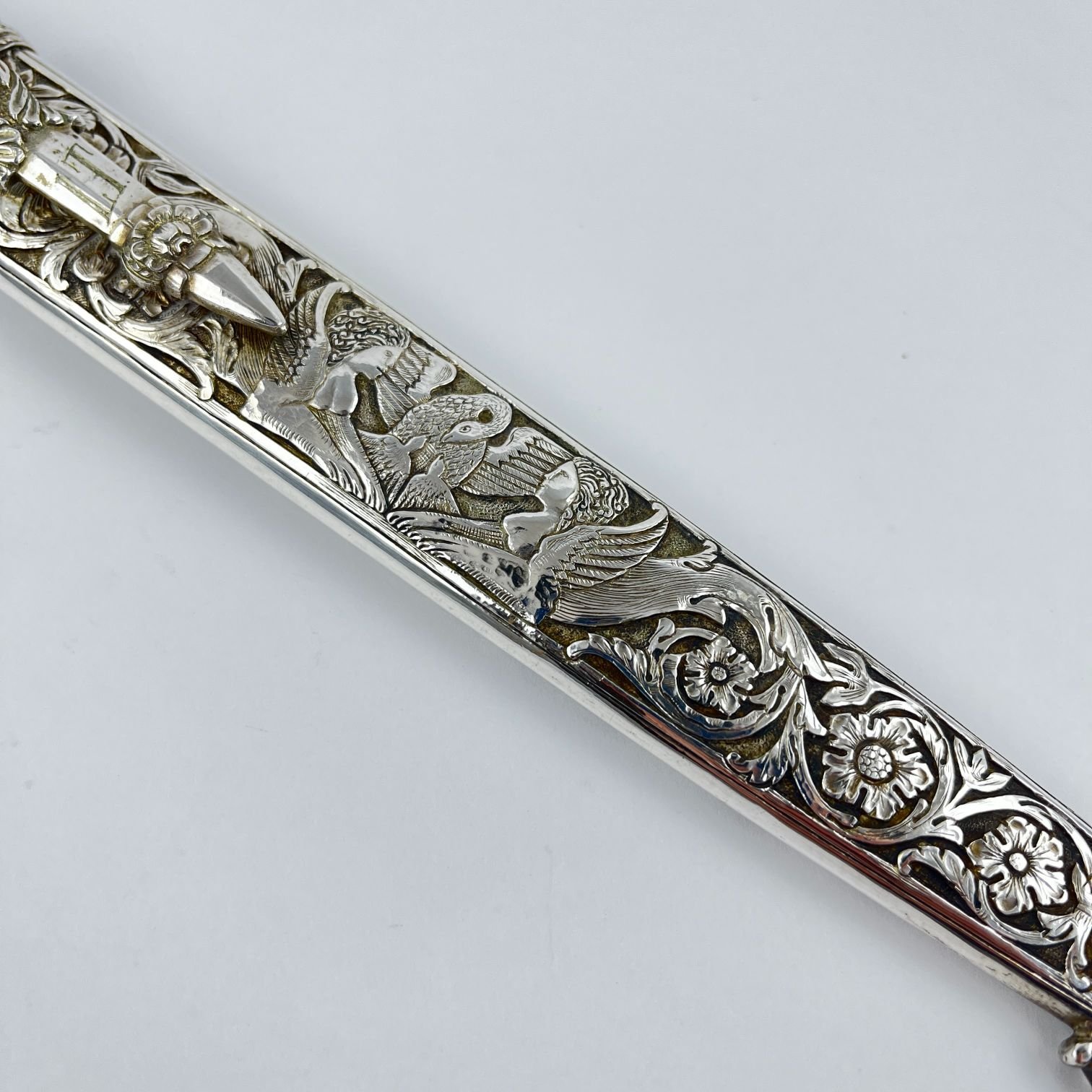Cuchillo criollo riograndense. Hoja “Corneta” en acero inoxidable. Cabo y vaina en plata cincelados «hojas, flores y aves». Cabo grabado con iniciales «L.T.» Largo total 35 cm. En estuche original.