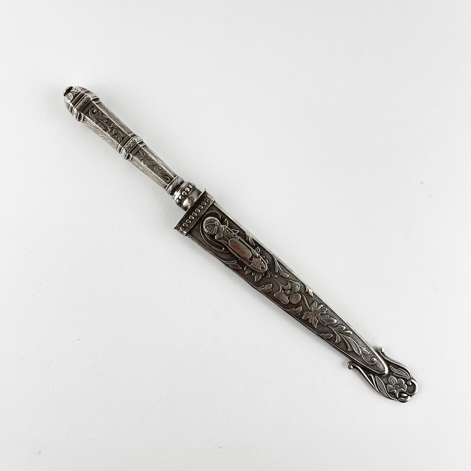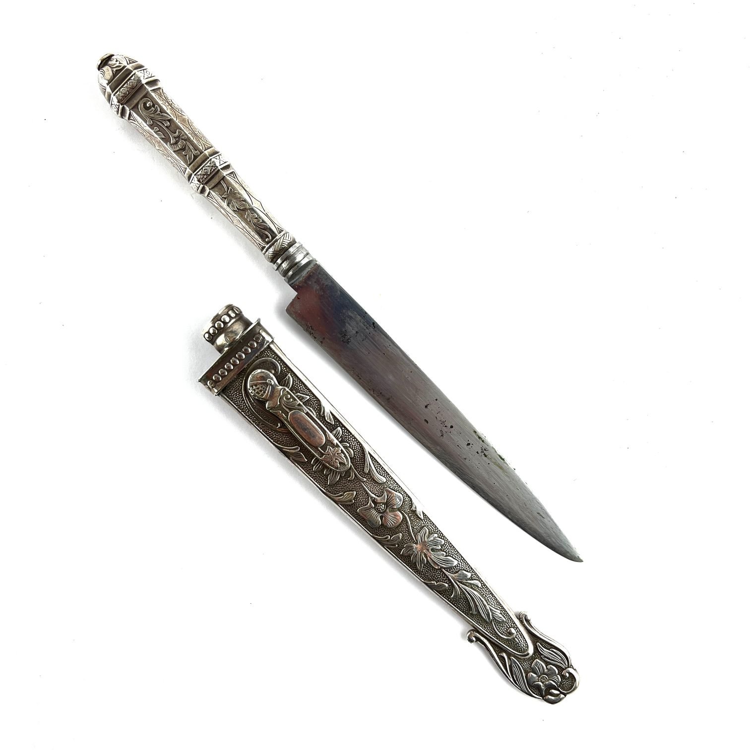 Cuchillo criollo riograndense. Hoja «Elmo» en acero inoxidable. Cabo facetado y vaina en plata decorada «hojas». Largo total 23.5 cm.