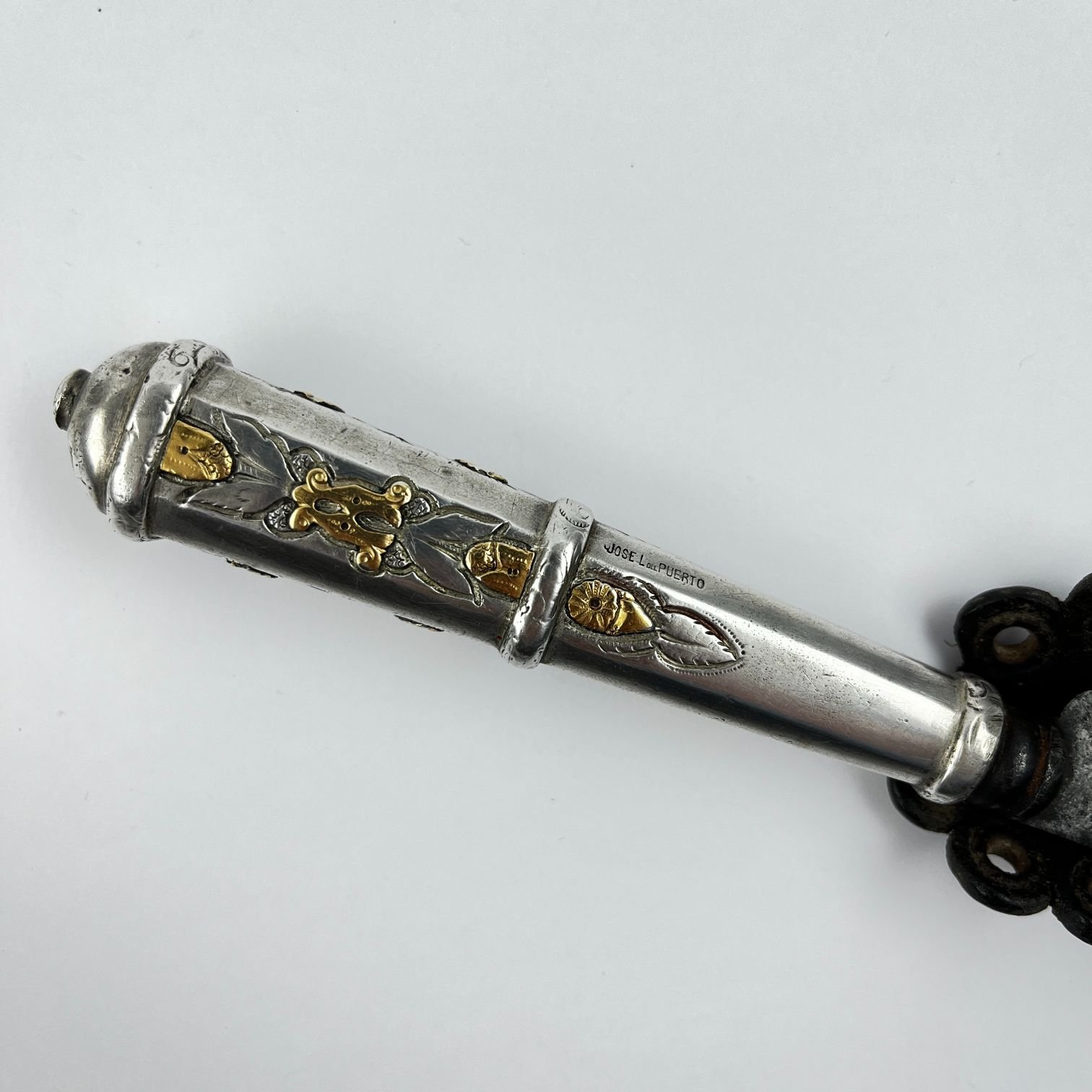 Cuchillo criollo. Hoja “Cazador a la Punta” de J.M. Mailhos, Montevideo, acier forge. Cabo facetado, bocavaina y puntera en plata y oro cincelados «hojas y flores». Vaina picasa en cuero negro. Largo total 49 cm.