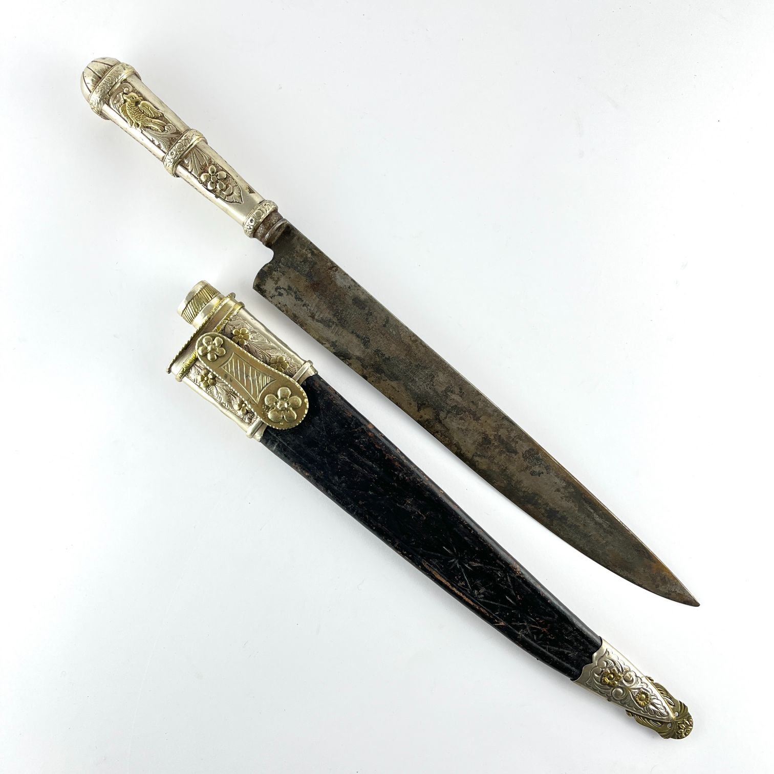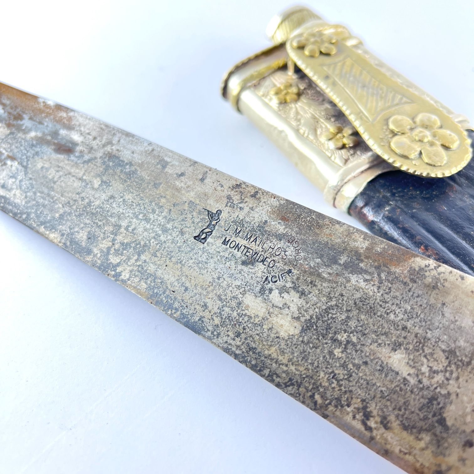 Cuchillo criollo. Hoja “Cazador a la Punta” de J.M. Mailhos, Montevideo, acier forge. Cabo facetado, bocavaina y puntera en plata y oro cincelados «hojas y flores». Vaina picasa en cuero negro. Largo total 49 cm.