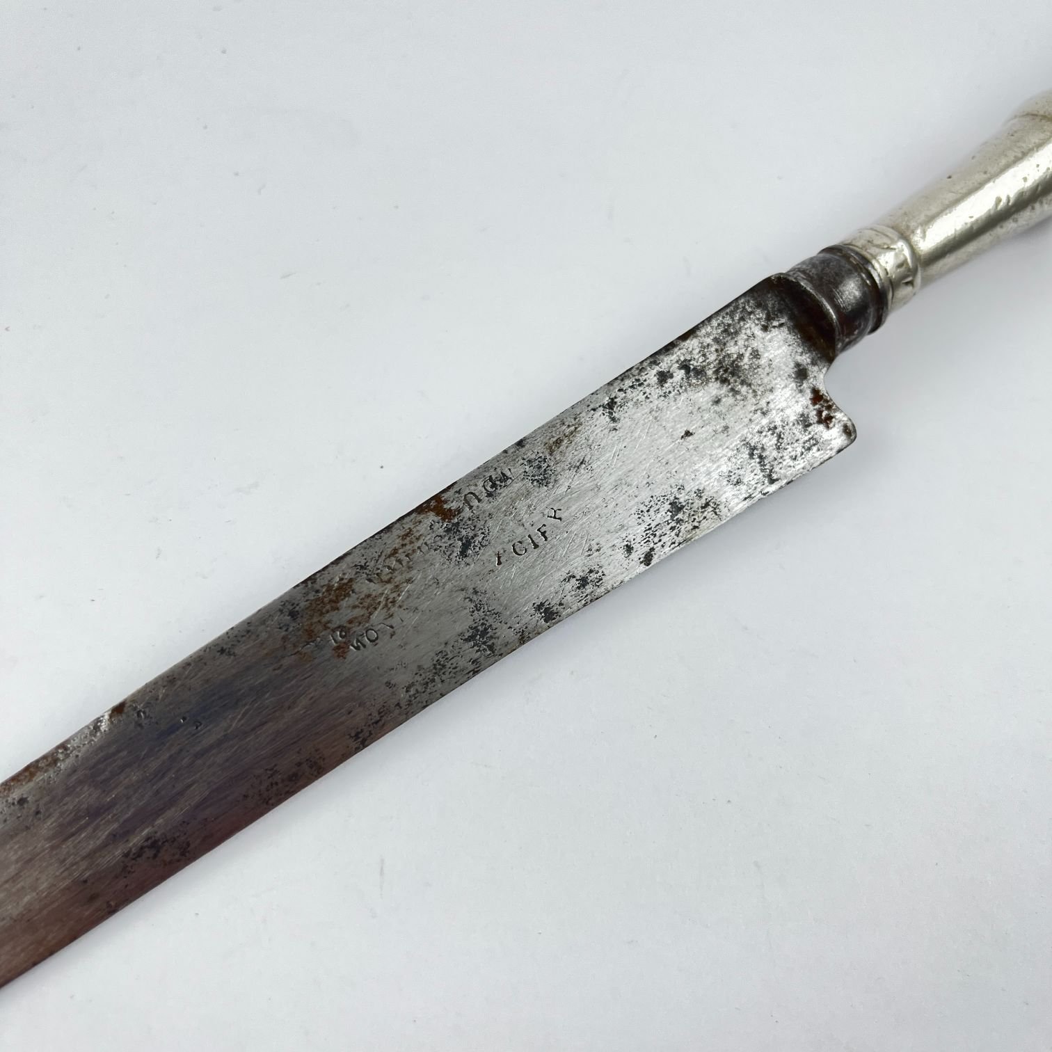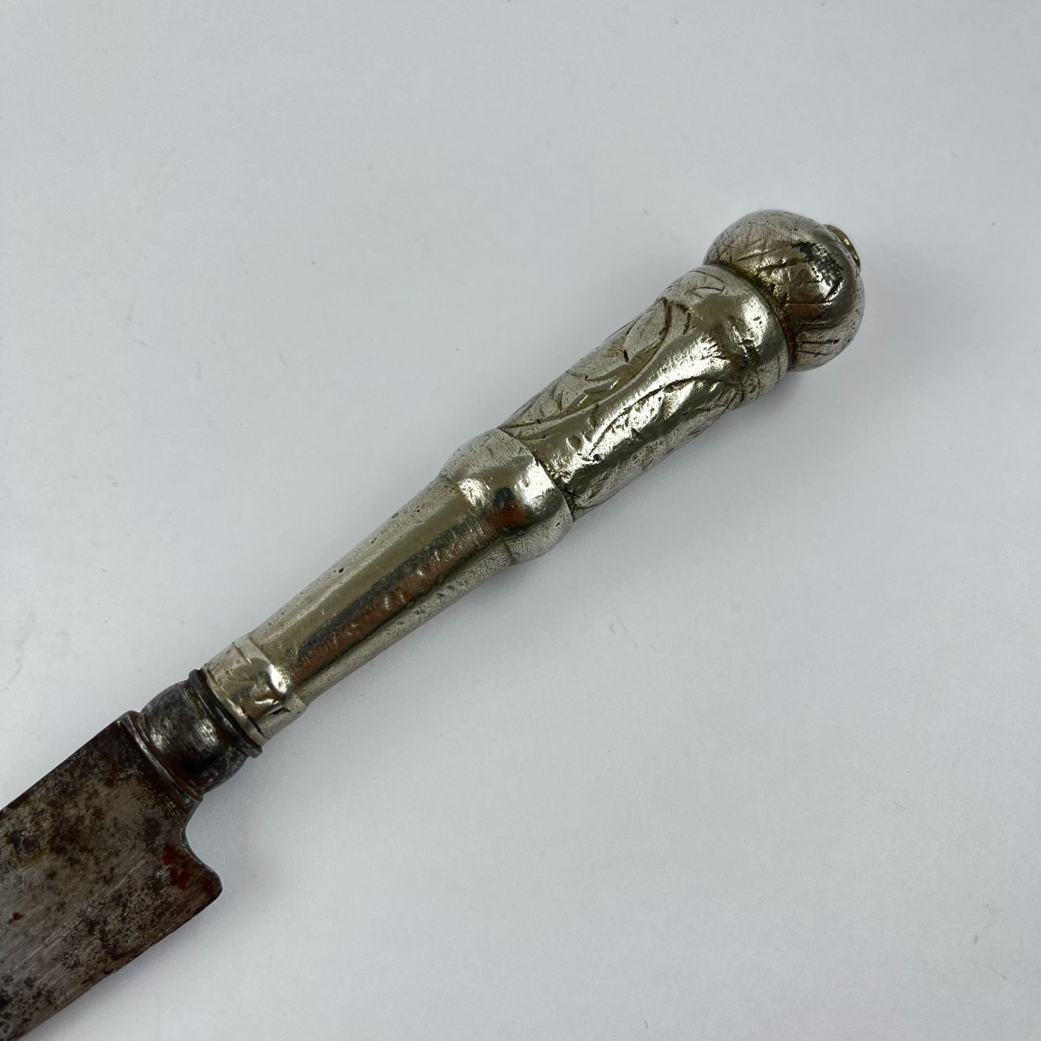 Cuchillo criollo. Hoja «Cazador al Filo» de J.M. Mailhos, acier fondu. Cabo en metal blanco decorado «flores». Largo 37.5 cm. Vaina en cuero negro.