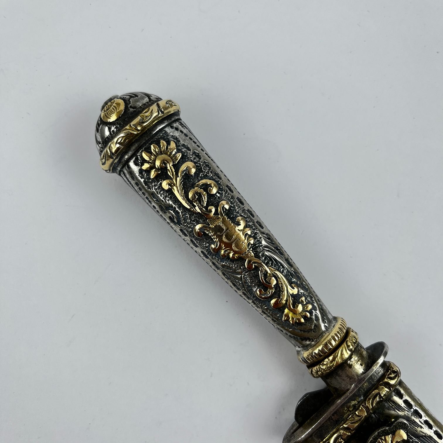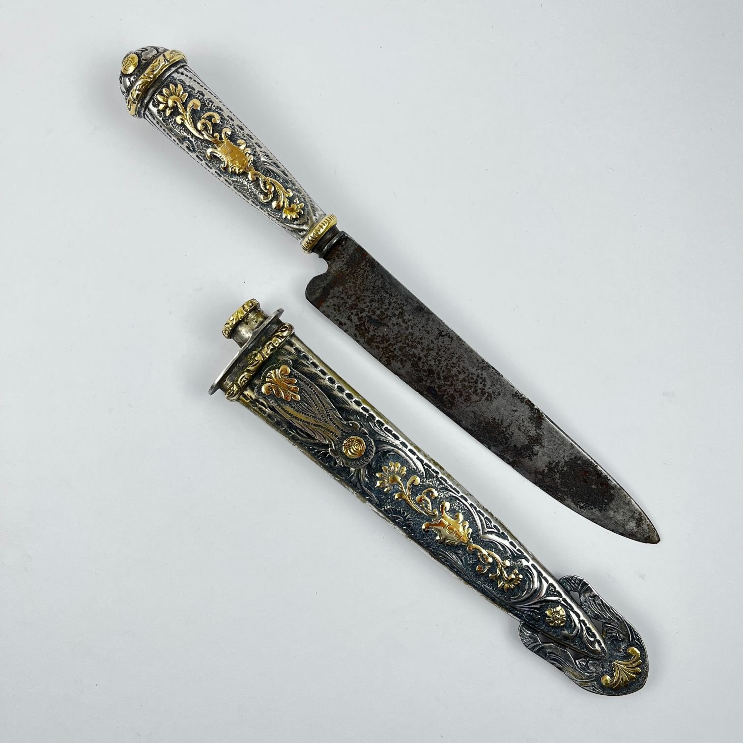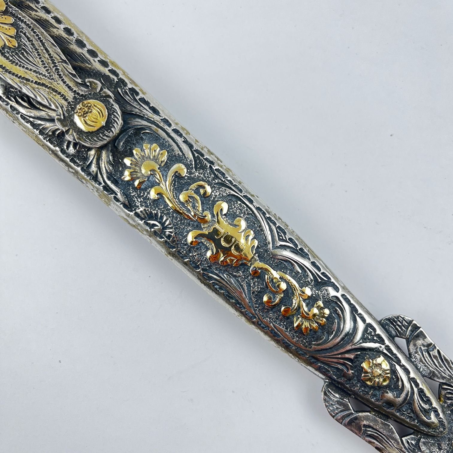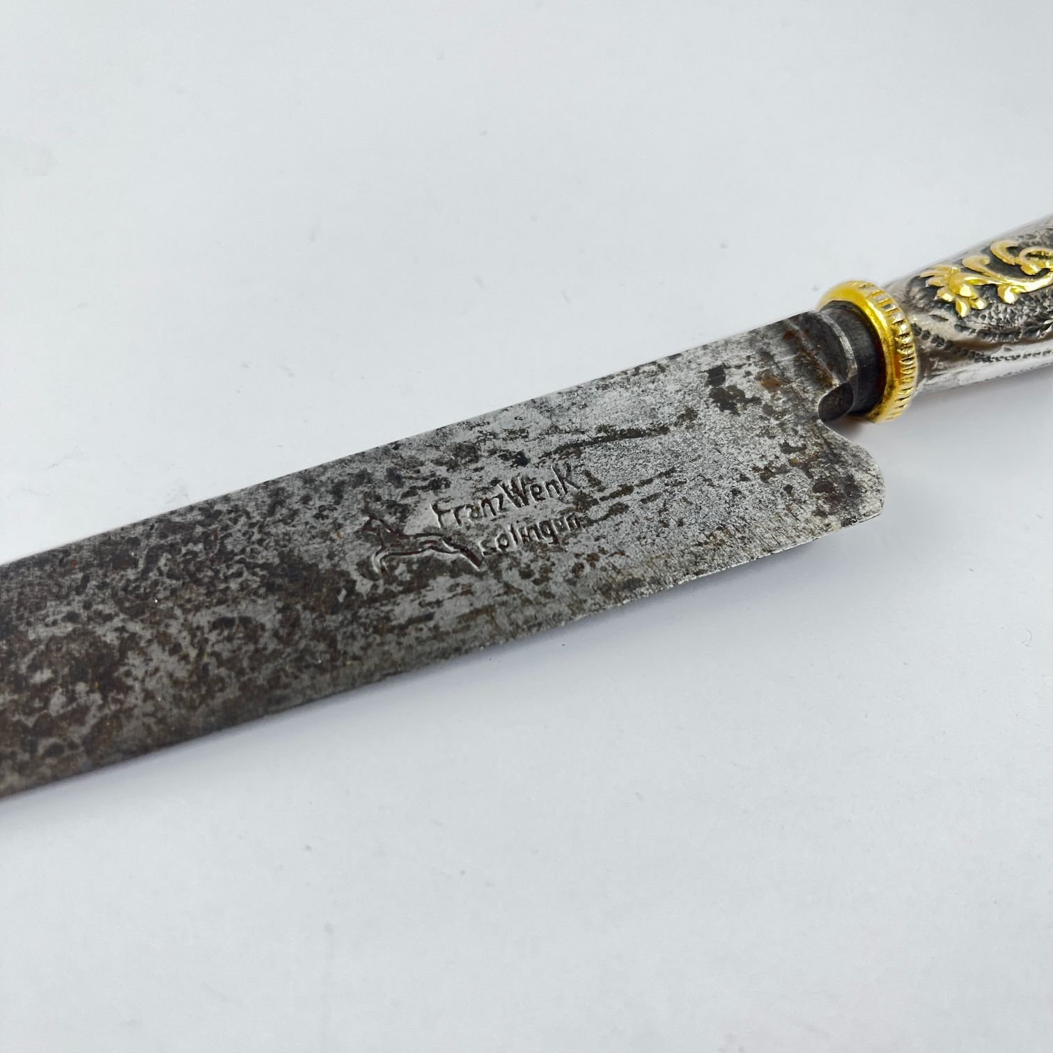 Cuchillo criollo. Hoja «Franz Wenk», Solingen. Cabo y vaina en plata y oro cincelados «hojas y flores». Inscripción grabada «City» e iniciales «J.C.G». Punzón de los plateros Martinez Hermanos. Largo total 28.5 cm.