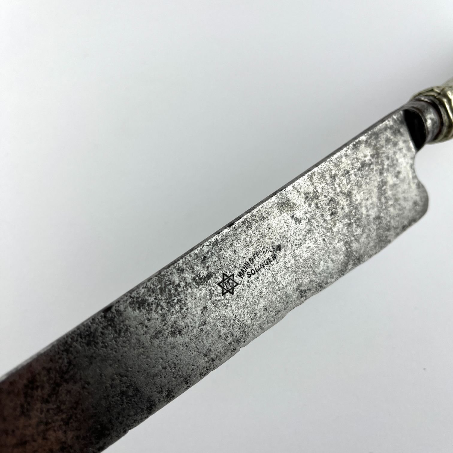 Cuchillo criollo. Hoja “Mann & Federlein”, Solingen. Cabo facetado en metal blanco decorado «hojas». Largo total 44 cm.