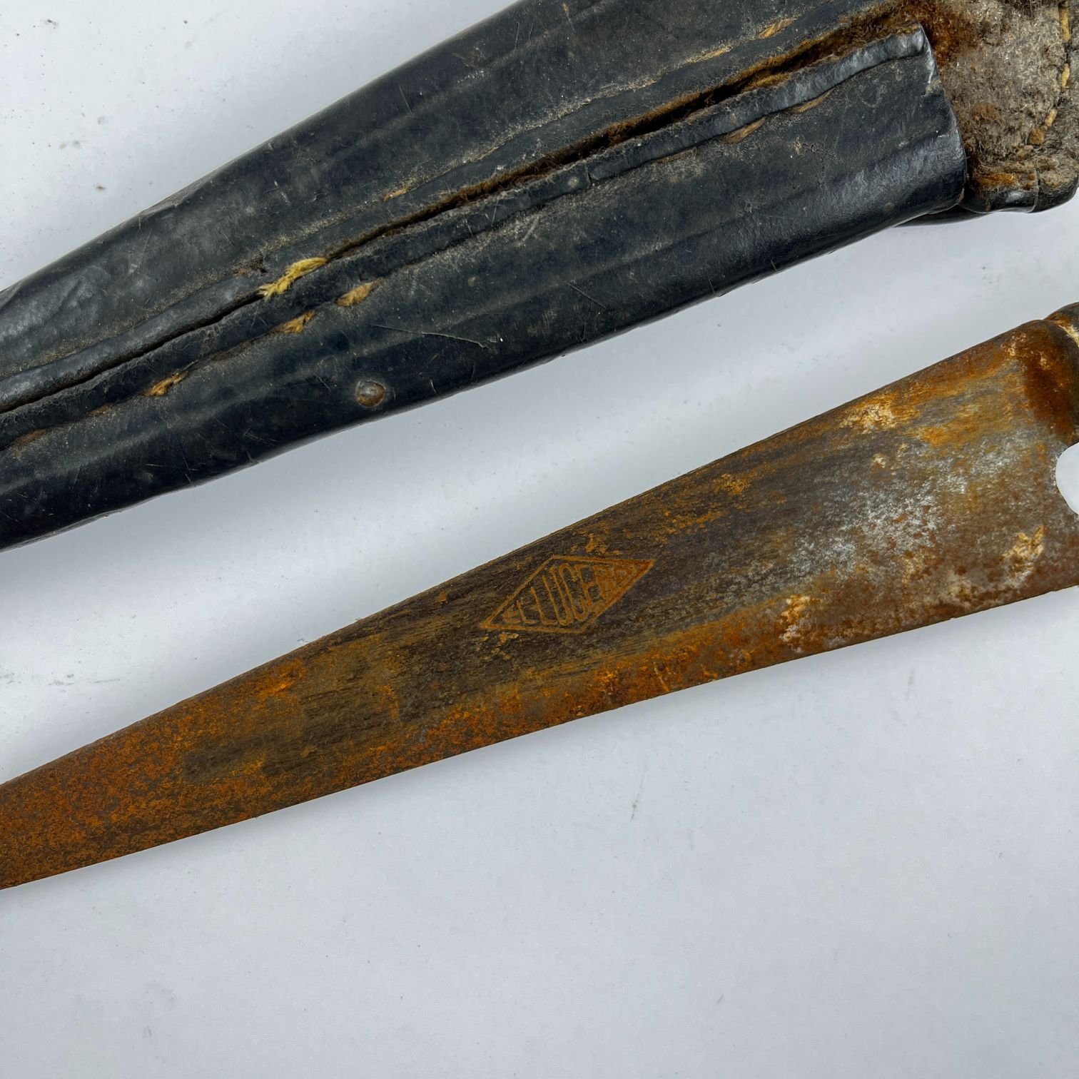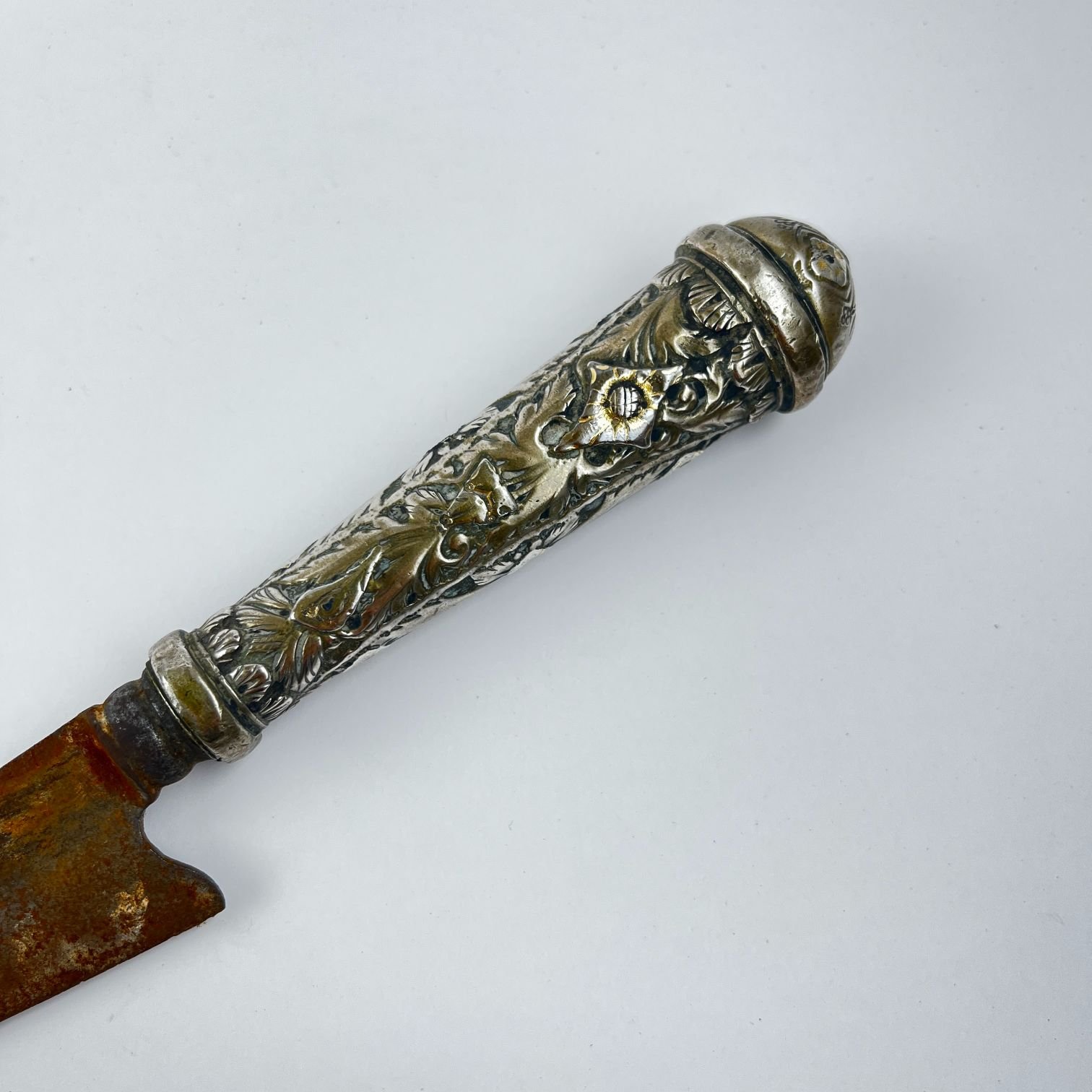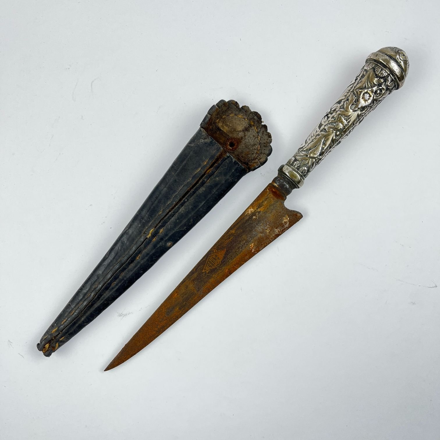 Cuchillo criollo. Hoja “El Lucero”. Cabo en plata y oro cincelados «hojas y flores», con iniciales «S.C.» grabadas. Largo total 26.5 cm. Vaina en cuero negro.