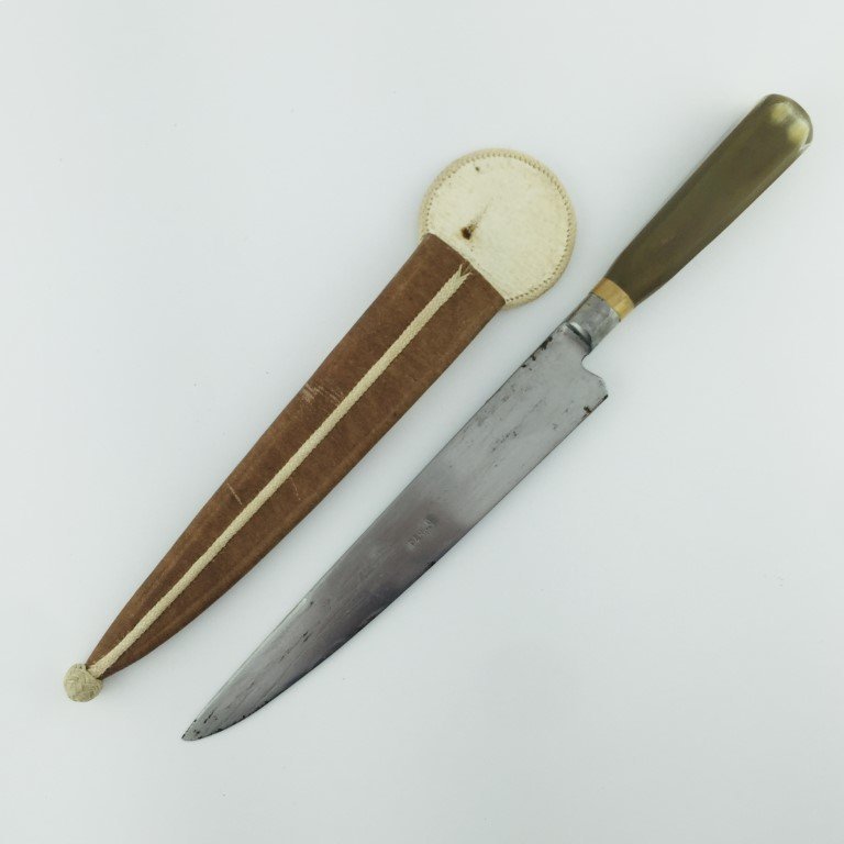 Cuchillo criollo. Hoja “Panián”. Cabo en guampa facetada. Virola en bronce. Largo total 25.5 cm. Vaina en cuero crudo, con detalles en fino cuero trenzado.