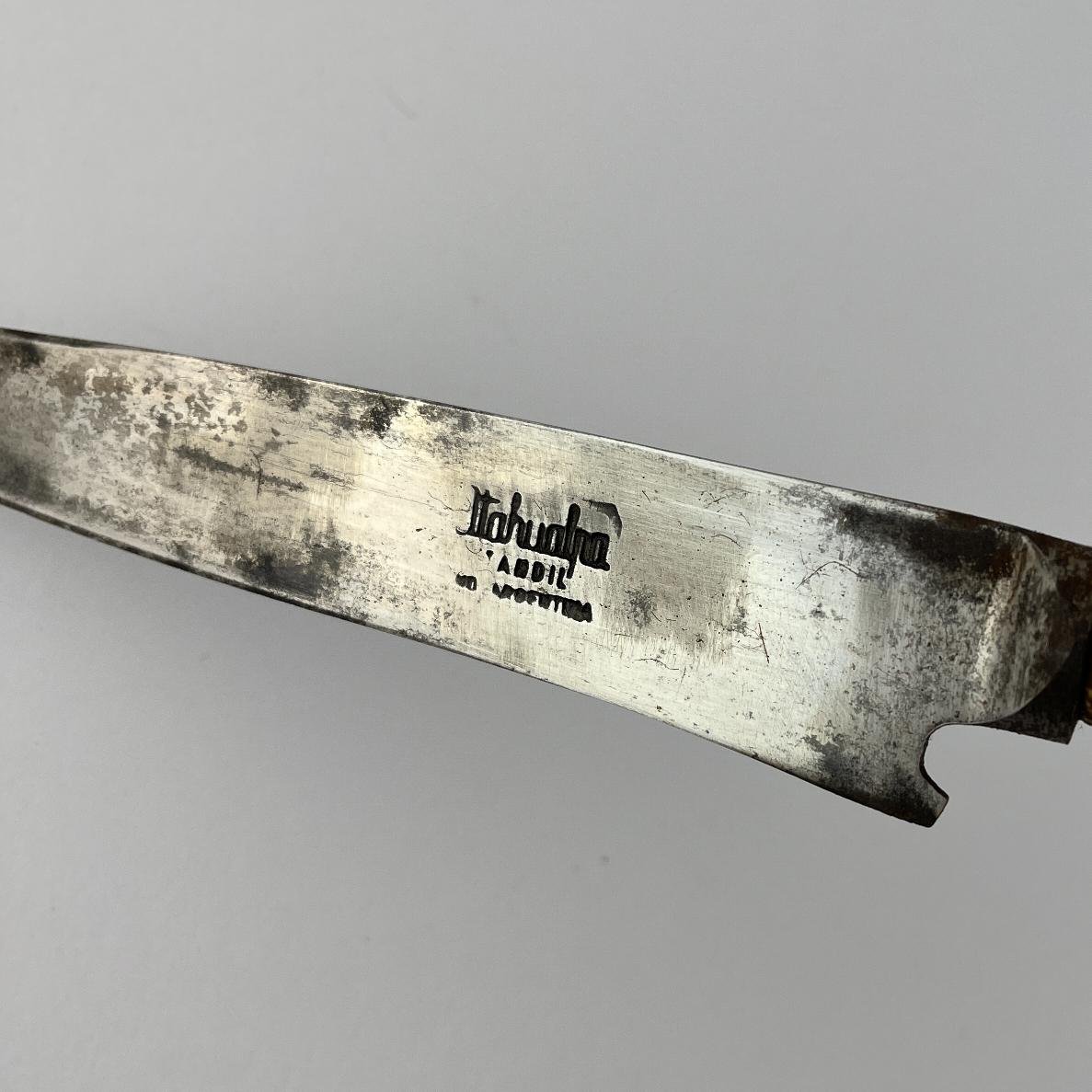 Cuchillo criollo argentino. Hoja «Atahualpa», Tandil. Cabo en fino cuero trenzado. Vaina en cuero crudo, con detalles en fino cuero trenzado y aplicación en cuero de yaguareté. Largo total 30 cm.