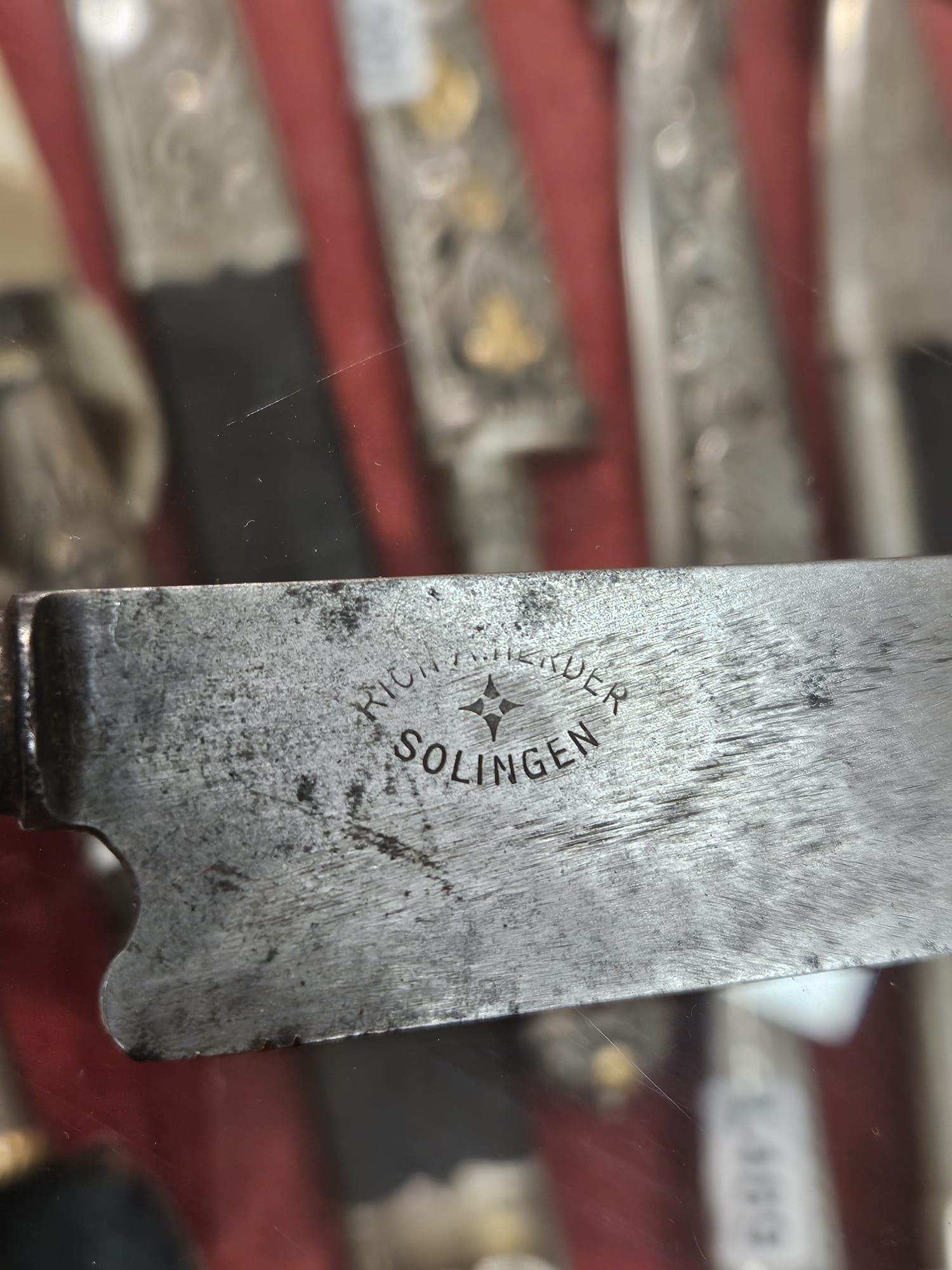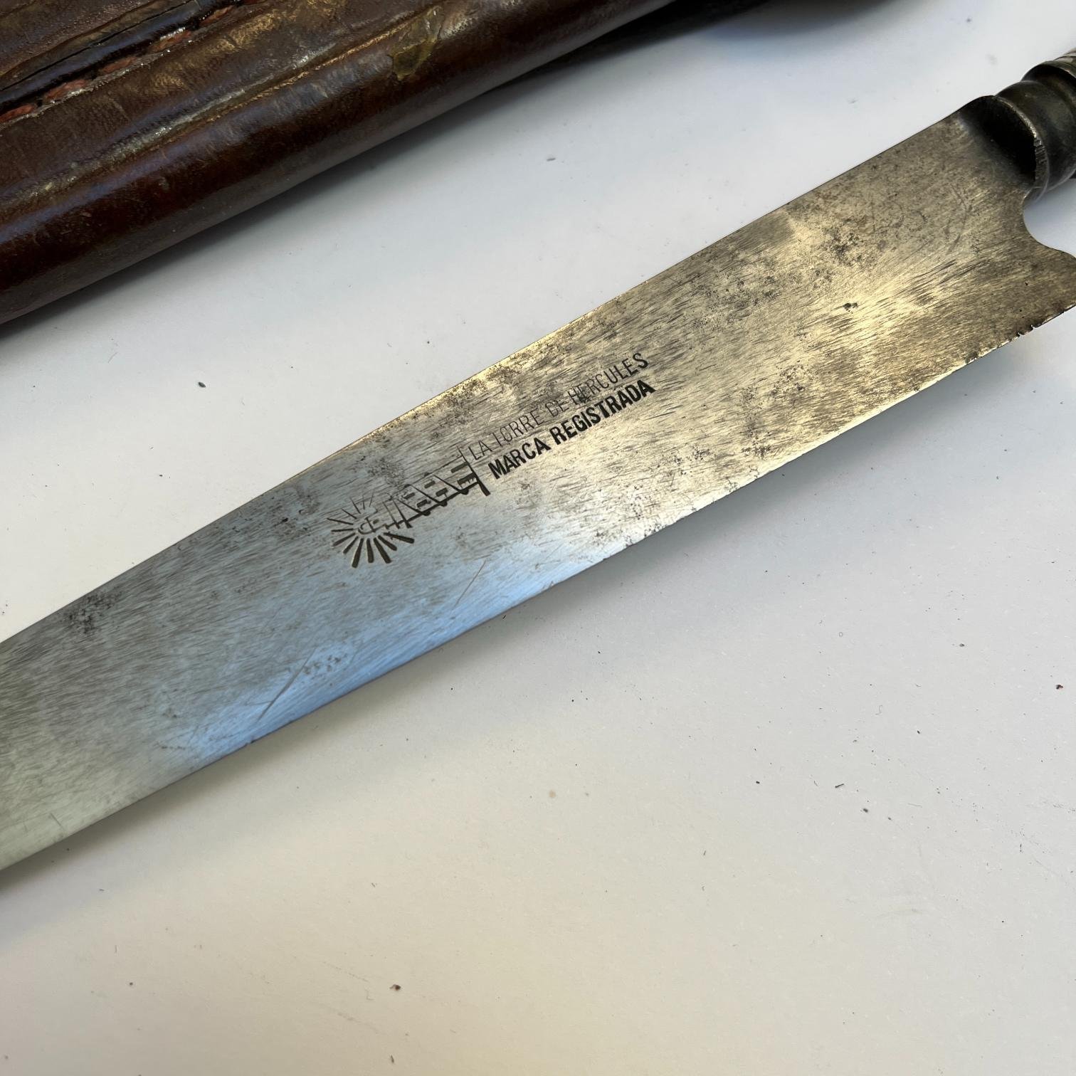 Cuchillo criollo. Hoja «Torre de Hércules», con marca del fabricante Rich A. Herder, Solingen. Cabo en guampa facetada y virola en plata. Largo total 31 cm. Vaina en cuero marrón.