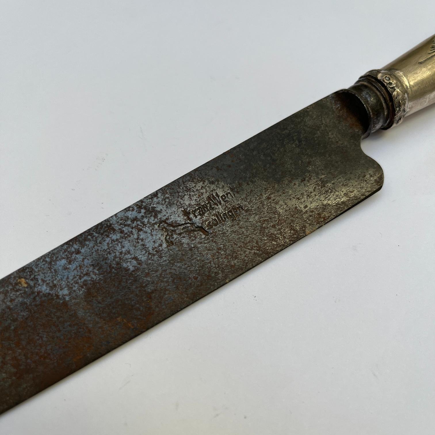 Cuchillo criollo. Hoja “Franz Wenk”, Solingen. Cabo en plata y oro cincelado «hojas y flores». Largo total 32 cm.