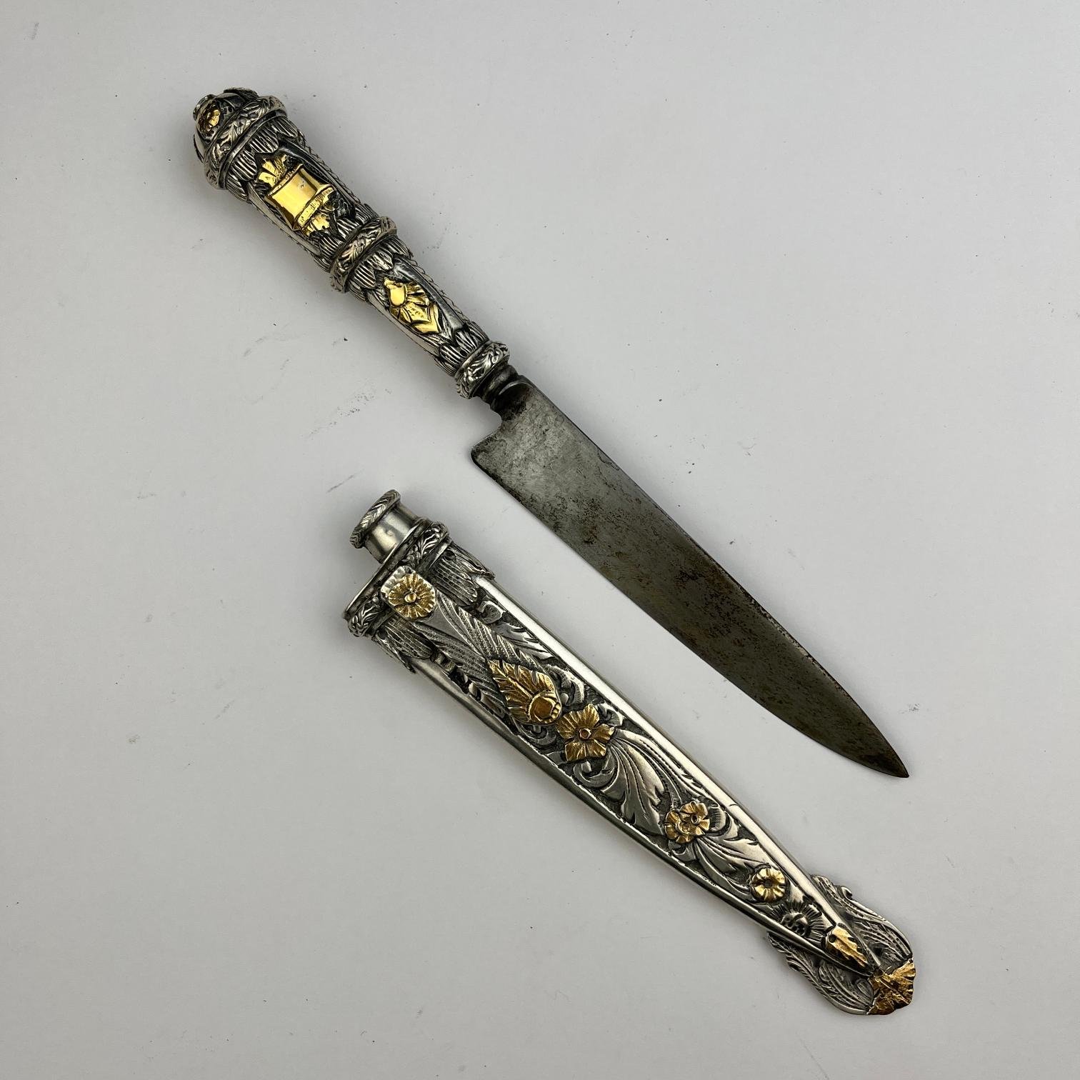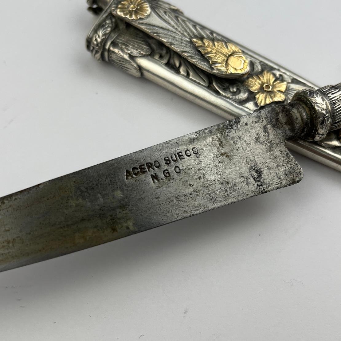 Cuchillo criollo. Hoja «Acero Sueco». Cabo y vaina en plata y oro cincelados «hojas y flores». Largo total 23.5 cm.