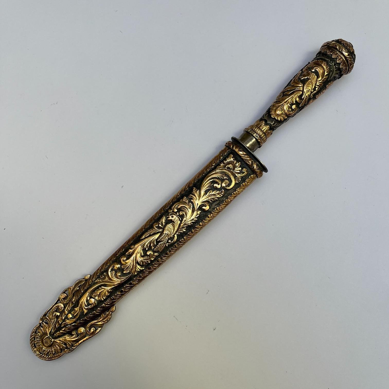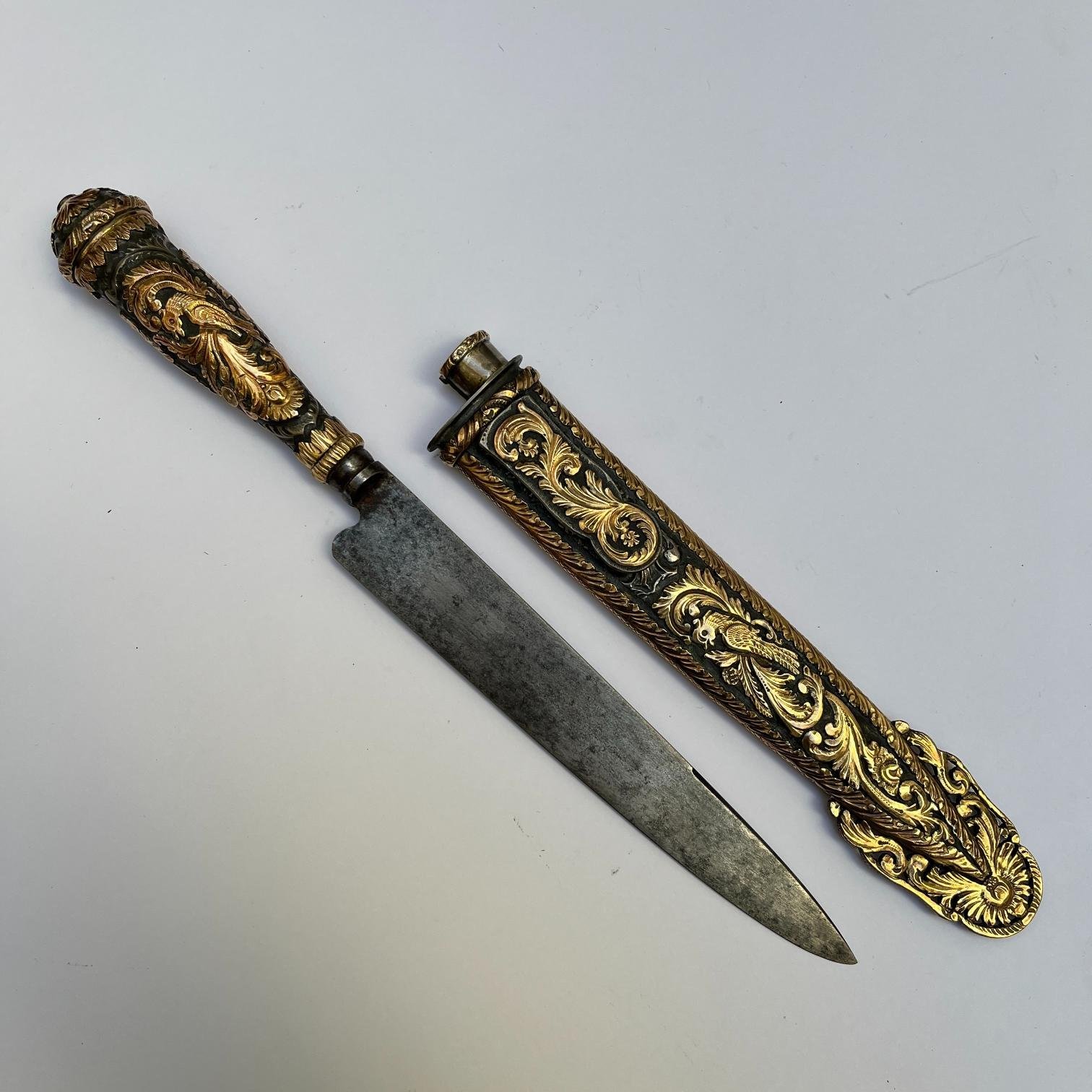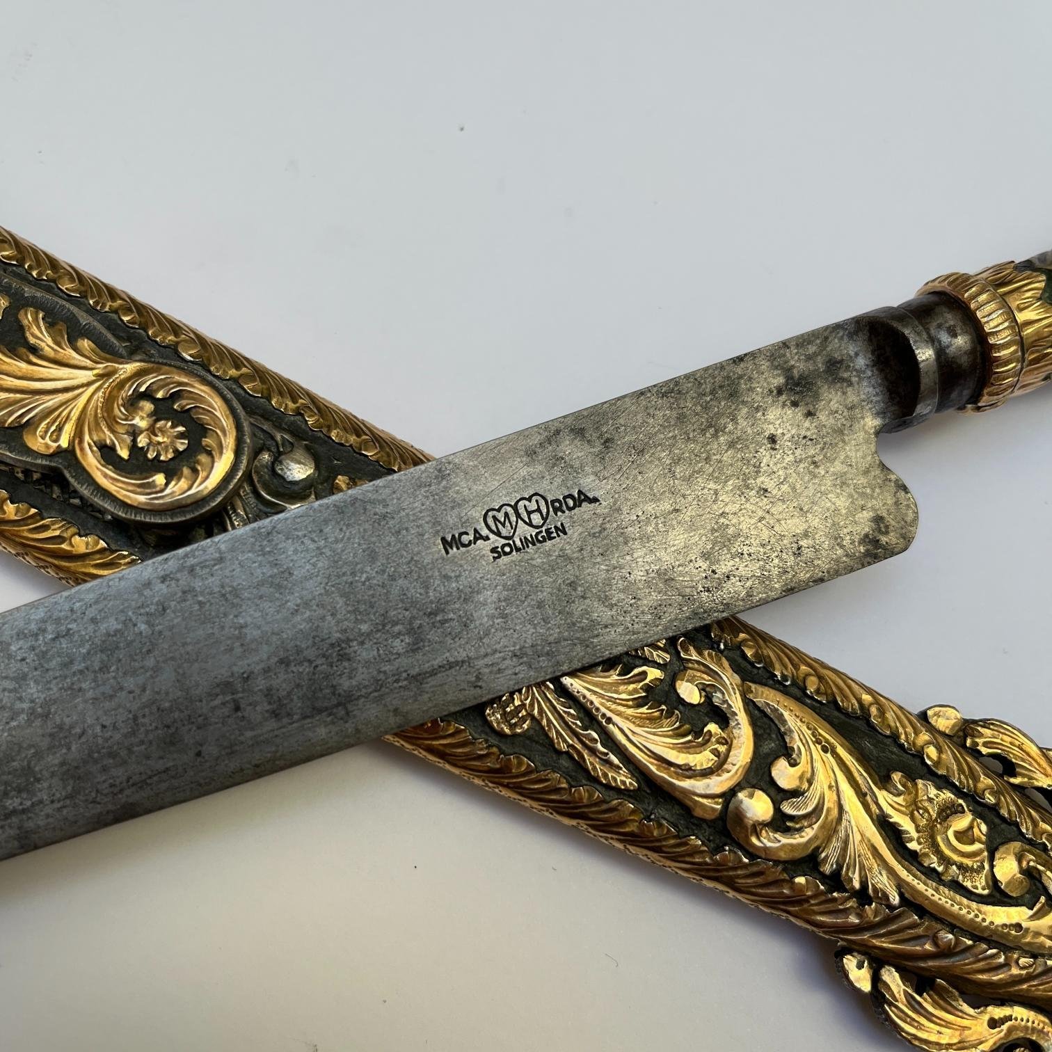 Cuchillo criollo. Hoja «M.H.», Solingen. Cabo y vaina en plata y oro totalmente cincelados «hojas, flores y aves». Realizado por los orfebres Martínez Hermanos de Montevideo. Largo total 31,5 cm.